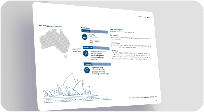 A tale of 44 cities | Sydney S e l f e v a u l a t i o n o f tH h eu hb u bi in nd i sc High Rankixa t ko e yr s a r e a Sydneys Best workspace and accelerators Hub features Top FinTech companies Hub profile Technologies Metamako, Data republic, Society One, Prospa. H on g Ko Big data Big investors ZngG Sapien Ventures, NAB Ventures, Investec, Reinventure, Angel and High Net Worth uo Data analytics rv ie cr Investor syndicates. hn Mobile m e Gn l o b a l F Cloud computing it Cn es n t r eu Success stories 1p S1p APIs ydo Since its launch in 2015, Stone & Chalk have connected startups to $100m AUD nr eyt in seed and angel investment, and 23 corporates. Innovation areas H2 Accelerator Investment management The future Frankf Stone & Chalk A big push in engaging with Asia. There will be more Asian companies setting urt Risk management In Wealth management up offices in Sydney and vice versa. There has been testing of APIs within the n INDEX SCOREo regulatory sandbox, which will now begin to be rolled out. There will also be Australia has robust wealth management and superannuation sectors va Lending and deposits t further development of FinTech ecosytems in other cities in Australia. Toronto51BDi o Payments and holds the lion’s share of the customer base in its region. It is the nisunioc n gateway ecosystem into Asia, especially South Asia with many global 45segutlu banking brands setting up their Asian headquarters in Sydney.ser Challenges There is a deep and skilled talent pool with high levels of mobile High cost of living penetration and internet banking.Low Rank Low access to capital noita Small size of market vonnIx91 Technology skills shortage laboeldnIise ReGpert gulao ex tionty t imi rox P Hub representative Stone & Chalk CEOFormers eign sto custo Alex ScandurraartupsProximity t Data to be updated in full report (Sibos, October 2017) 107