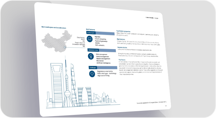 A tale of 44 cities | Shanghai S e l f e v a u l a t i o n o f tH h eu hb u bi in nd i sc High Rankixa t ko e yr s a r e a Shanghais Best workspace and accelerators Hub features Top FinTech companies Hub profile Technologies Alipay, China PNR, Lu.com, ppdai.com, dianrong.com, Eastmoney.com, Wind Info, Wa Zhong An Insurance. r s awG Big data Big investors To Cloud Valley Cloud computing elv Ae iStart vr Sequoia Capital, IDG Capital Partners, Bank of China, CDH Investments, Wanda, in Payment gateways vm KIC e Gome and Sunig, Guotai Jun’an Securities, Sinolink Securities, Fosun, SAIF Capital. Gn l o b a l F Mobile it Cn People Squared es n t r eu 1p S6p Sinovation Ventures P2P networks ho angr YBC Success stories ht ai Lufax, an online internet finance marketplace valued at $18.5bn. nD oo Innovation areas iB tui a7sn v8ig on ne Zhong An Insurance, an Internet Insurance company, established by Ant ns Is Ll Risk managment ia s bobx FinancialServices, Tencent Holdings Ltd. and Ping An Group, valued at $8bn. noe Gld Asset management n5 I2In Wealth management n INDEX SCOREo The future va Blockchain t As the traditional financial hub in China, Shanghai will experience growth and Shenzheni o Artificial intelligence c n consolidation as new FinTech segments come together. There is a strategy in China is the largest FinTech market in the world as measured by total 119utlu place to construct a science and technology innovation centre and we expect to investment, total addressable market, and digital usage. A digital savvy er Challenges see growth in new technology areas such as virtual reality, biometrics, Big data- population along with an under-developed financial industry has Regulatory uncertainty based risk management, blockchain and AI. These will be supported by increased opened up new opportunities for FinTech to make a significant impact.Low Rank Skills shortages – technology government support, improved regulatory environment and implementation of High cost of living Free Trade Zone policies. tise Reper gulao ex tionty t imi rox P Hub representativeFormers ASIFIeign sto custo artupsProximity t President Wan Jianhua Data to be updated in full report (Sibos, October 2017) 101