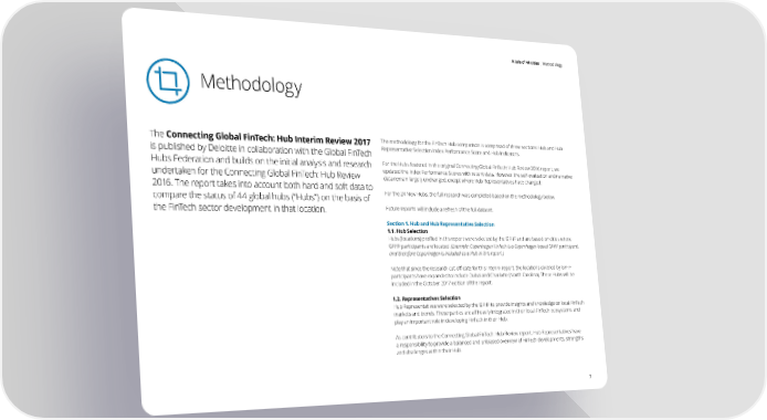 A tale of 44 cities | Methodology Methodology The Connecting Global FinTech: Hub Interim Review 2017 The methodology for the FinTech Hub comparison is comprised of three sections: Hub and Hub is published by Deloitte in collaboration with the Global FinTech Representative Selection Index Performance Score and Hub Indicators. Hubs Federation and builds on the initial analysis and research For the Hubs featured in the original Connecting Global FinTech: Hub Review 2016 report, we undertaken for the Connecting Global FinTech: Hub Review updated the Index Performance Scores with recent data. However, the self-evaluation and narrative data remain largely unchanged, except where Hub Representatives have changed. 2016. The report takes into account both hard and soft data to For the 24 New Hubs, the full research was completed based on the methodology below. compare the status of 44 global hubs (“Hubs”) on the basis of the FinTech sector development in that location. Future reports will include a refresh of the full dataset. Section 1. Hub and Hub Representative Selection 1.1. Hub Selection Hubs (locations) profiled in this report were selected by the GFHF and are based on cities where GFHF participants are located. (Example: Copenhagen FinTech is a Copenhagen-based GFHF participant, and therefore Copenhagen is included as a Hub in this report.) Note that since the research cut-off date for this Interim report, the locations covered by GFHF participants have expanded to include Dubai and Charlotte (North Carolina). These Hubs will be included in the October 2017 edition of the report. 1.2. Representatives Selection Hub Representatives were selected by the GFHF to provide insights and knowledge on local FinTech markets and trends. These parties are all heavily integrated in their local FinTech ecosystems and play an important role in developing FinTech in their Hub. As contributors to the Connecting Global FinTech: Hub Review report, Hub Representatives have a responsibility to provide a balanced and unbiased overview of FinTech developments, strengths and challenges within their Hub. 7