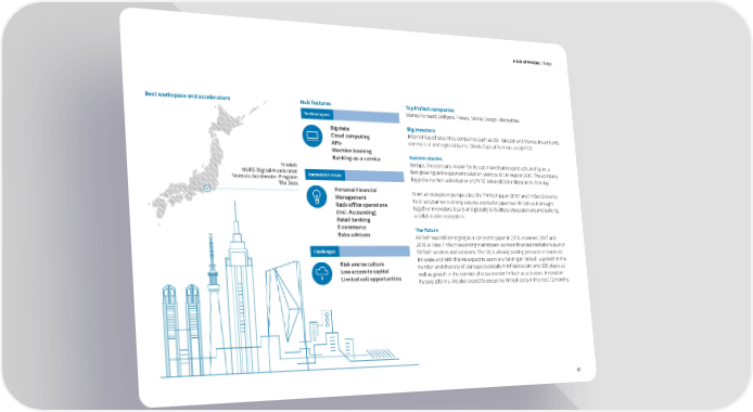 A tale of 44 cities | Tokyo S e l f e v a u l a t i o n o f tH h eu hb u bi in nd i sc High Rankixa t ko e yr s a r e a Tokyo s Best workspace and accelerators Hub features Top FinTech companies Hub profile Technologies Money Forward, Bitflyers, Freeee, Money Design, Moneytree. T o r o n Big investors toG Big data Internet based securities companies such as SBI, Rakuten and Monex, incumbents Sto Cloud computing ov ce kr commercial and regional banks, Globis Capital Partners and JAFCO. hn APIs olm me Gn l o b a l F Machine learning it Cn es n t r eu Success stories T5p Banking-as-a-service okDp yooo Metaps, the company known for its app monetisation products and Spike, a Bir u nt 3sg Finolab i 4n e fast-growing online payment solution, went public in August 2015. The company s MUFG Digital Accelerator s Nomura Accelerator Program Innovation areas logged a market capitalisation of JPY 32 billion ($263 million) on its first day. Dubl The Dots Japan has seen strong growth in the FinTech ecosystem in the past two in Personal Financial From an ecosystem perspective, the “FinTech Japan 2016” and FinSum2 events years, as FinTech startups, industry players, regulators and government Management held last year were strong success stories for Japanese FinTech as it brought nIn Back-office operations on have collaborated to build a sustainable and scalable environment for iINDEX SCOREo together innovators locally and globally to facilitate discussion around building tv aa (incl. Accounting) vt a collaborative ecosystem. innovation. Tokyo has a vibrant FinTech network, and the regulators oi o Taipeinn Retail banking nI l have recently launched FinTech-friendly laws around blockchain and aboxed655tluc E-commerce The future APIs, along with initiatives to support new FinTech startups. As the third lGnI1eru Robo advisors FinTech was still emerging as a concept in Japan in 2016. However, 2017 and largest economy in the world, there is opportunity for both B2C and 2018 will see FinTech becoming mainstream as more financial institutions launch B2B players to enter the market.Low Rank Challenges FinTech services and solutions. The FAJ is already putting pressure on banks to Risk averse culture innovate and with this we expect to see more funding in FinTech, a growth in the Low access to capital number and diversity of startups (especially in infrastructure and B2B plays), as tise Limited exit opportunities well as growth in the number of cross-border FinTech accelerators, innovation Reper hubs/platforms. We also expect to see some FinTech exits in the next 12 months. gulao ex tionty t imi rox P Hub representative FinTech Association of JapanFormers eign sto custo CEOartupsProximity t Hiroki Kudo & Hiroki Maruyama 69