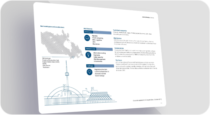 A tale of 44 cities | Toronto S e l f e v a u l a t i o n o f tH h eu hb u bi in nd i sc High Rankixa t ko e yr s a r e a TorontosBest workspace and accelerators Hub features Top FinTech companies Hub profile Technologies FinanceIT, WealthSimple, League, Thinking Capital, Bioconnect, Zafin, Wave S Accounting and Gold money. yd n e yG Big data Big investors Fro Cloud computing av ne kr OMERS Ventures, Georgian Partners, Information Venture Partners, Business fun RPA / cognitive rtm e Development Bank of Canada (BDC), Investment Accelerator Fund (IAF) and Power Gn l o b a l F APIs it Cn es n t r Teu Corporation of Canada. 1p or3p Blockchain onto or Toronto is recognised as one of the largest and most stable financialt Success stories centres in the world that encompasses a diverse tech and Innovation areas Founded in 2006, Shopify is an e-commerce company which provides software S for online stores and retail point-of-sale systems. Shopify’s initial public offering t oc academic community. Nearly 80% of fintech startups in Canadakhol are Toronto-based and supported by government, private investors m Alternative lending in 2015 valued the company at $1.27 billion and today it has more than 1,750 Payments employees around the world. and the corporate community. Incumbent banks are dedicatingIn Cyber security n nINDEX SCOREo ov 500 startups 40-60% of their FinTech innovation budgets to areas such as artificial tia Risk Management at The future Tokyovi oCreative Destruction Lab intelligence, cybersecurity and blockchain. Venture-capital financingonn E-Commerce nI l22suBoDuc Digital Media Zone (DMZ) 2017 will see a growing focus on Artificial Intelligence and Cyber security in in Canadian FinTech was up 74% from 2015 to 2016, its highest level abolxedn5150enignirutlMaRS Toronto. As well as this, we expect to see further regulatory developments, since 2000. This growth continues to attract global banks, investorsGIsseOne ElevenChallenges particularly as the regulatory sandbox develops, and more connections with Techstars other international hubs. The next Sibos conference will also be held in Toronto and startups that are looking to set-up shop and expand their Regulatory barriers FinTech innovation in Toronto.Low Rank Lack of competition in in October 2017. domestic market e Talent leakage rtis Reguxpe latto e ionity xim Pro Hub representative MaRS Discovery District CEOFormers eign sto custo Ilse TreurnichtartupsProximity t Data to be updated in full report (Sibos, October 2017) 111