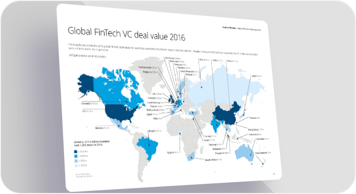 A tale of 44 cities | Global FinTech VC deal value 2016 Global FinTech VC deal value 2016 The map below shows the 2016 global FinTech deal values for countries covered by this Interim report. Note that Bahrain, Hungary, Kenya and UAE had deal values less than $1 million and therefore were not included in the map below. All figures below are in US Dollars. Germany $384m Russia $7m India $272m China $7.7bn Denmark $32m Norway $4m Netherlands $20m Sweden $62m Belgium $28m Czech Republic $6m Japan $87m Poland $1m UK $783m Ireland $524m Canada $183m Luxembourg $2m France $68m US $6.2bn Switzerland $34m Spain $12m Italy $9m Taiwan $6m Mexico $72m Brazil $161m Hong Kong $170m Turkey $17m Indonesia $5m Globally, $17.4 billion invested Israel $173m Australia $91m over 1,436 deals in 2016 Thailand $19m ≥ $500m Malaysia $4m ≥ $100m Nigeria $1m Singapore $86m ≥ $10m New Zealand $7m < $10m South Africa $15m Source: PitchBook Compiled by Deloitte 19