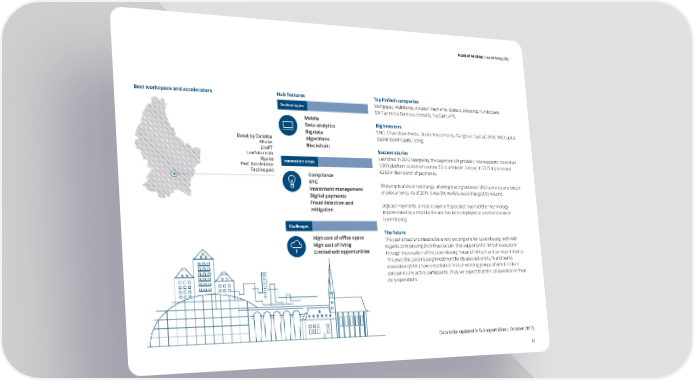 A tale of 44 cities | Luxembourg City S e l f e v a u l a t i o n o f tH h eu hb u bi in nd i sc High Rankixa t ko e yr as r e a Luxembourg Citys Best workspace and accelerators Hub features Top FinTech companies ‡ub profile Technologies Mangopay, Multifonds, Amazon Payments, iDetect, Bitstamp, Fundsquare, P SIX Payments Services, Investify, PayCash, APS. aris G Mobile Big investors Oo Data analytics sv loe r n SNCI, Chameleon Invest, Docler Investments, Mangrove Capital, LBAN, 360 Capital, m Big data e Gn l o b Saphir, GGM Capital, Sting. a l F it Boost by Deloitte Cn Algorithms es n t r neu Khube 1p o2 i tp Blockchain Lua vo xo LhoFT enr Success stories mnt I bl oua Luxfuturelab rgb x Launched in 2012 MangoPay, the payment API provider, now supports more than o le CGd Nyuko itynD Innovation areas I2Bo 1,000 platform customers across 22 countries in Europe. In 2015 it processed 1ui PwC Accelerator 5sn 9ig n Technoport €200 million worth of payments. e As Compliance bs u D h a Luxembourg is Europe’s leading investment fund centre and home to bi KYC In Bitstamp is a bitcoin exchange, allowing trading between USD currency and bitcoin more than 140 international banks and 150 FinTech companies and n Investment management INDEX SCOREo cryptocurrency. As of 2016 it was the world’s second largest by volume. v over 10000 people orking in the sector The cit is also host to a Digital payments t Kuala Lumpuri o multiple accelerators hich are managed b top financial plaers such c n Fraud detection and Digicash Payments, a mobile payment specialist, has had their technology as aribas €n parallel the government is particularl accessible 83utlu mitigation implemented by 4 retail banks and has been deployed at a national scale in and supportive offering extensive ƒ„… grants the implementation of er Luxembourg. a highl efficient €T infrastructure and specific regulations adapted to Challenges the financial services sectorLow Rank The future High cost of office space The year ahead promises to be a very exciting one for Luxembourg, both with High cost of living regards to improving the infrastructure that supports the FinTech ecosystem ise Limited exit opportunities through the creation of the Luxembourg House of FinTech and services industry. Rert This year, the Luxembourg investment funds association (ALFI) and banks egula exp association (ABBL) have established FinTech working groups of which FinTech tioy to nmit companies are active participants. Thus, we expect that the collaboration in their oxi daily operations. Pr Hub representative Luxembourg for Finance Formers CEOeign sto custo Nicolas MackelartupsProximity t Data to be updated in full report (Sibos, October 2017) 91