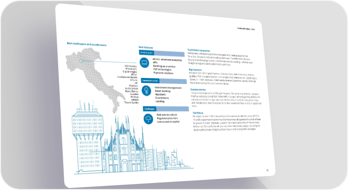 A tale of 44 cities | Milan S e l f e v a u l a t i o n o f tH h eu hb u bi in nd i sc High Rankixa t ko e yr s a r e a Milans Best workspace and accelerators Hub features Top FinTech companies Hub profile Technologies MoneyFarm, AdviseOnly (portfolio management); Satispay (payments); Bru Smartika, Borsadelcredito.it (lending); Siamosoci, Crowdfundme, Starsup sse AI (incl. advanced analytics) (equity crowdfunding); Credimi, Workinvoice (invoice trading); Euklid (bitcoin l MsG & algotrading) and Sardex (alternative currency). o APIs av de rr in dm Banking-as-a-service e 012 Factory Big investors Gn l o b a l F P2P technologies it Cn B!Ventures es n t r eu Innogest SGR, 360 Capital Partners, Principia SGR, United Ventures, Invitalia 5p Mi3p Digital Magics Payment solutions l ano dPixel (public), P101, Panakes Partners, Primomiglio SGR, SellaVentures, Digital Magics, r t Fondazione Filarete Dpixel, H – Farm Ventures, Finlombarda Gestioni, Quadrivio Capital, Vertis Sgr, n H-Farm Innovation areas Neva Finventures (CVC) and LVenture Group. o i i3P t a Bv ango iStarters k on kn Investment management I LUISS Enlabs Success stories l ax Retail banking be Nana Bianca There are no large exits or IPOs yet. However, MoneyFarm is an Italian company oI ld9n Gn Neo bank Milan is the most attractive city in Italy for launching a startup. I2n Nuvolab INDEX SCOREo that has collected almost $30 million within 5 years. At the beginning of 2016, the Almost one thousand tech companies have established their va Polihub E-commerce t company extended its operations to the UK and announced new partnerships Budapesti o Sellalab Lending headquarters in Milan due to its proximity to the rest of Europe and c n Talent Garden with Revolut and Uber. It received $7 million investment from Allianz in September the presence of major national institutional investors, banks and 132utlu 2016. multinational tech companies such as Google, Facebook, Microsoft, er Challenges Cisco in the city. The city also hosts Borsa Italiana (the local stock Risk averse culture The future exchange) and is the financial centre of the country. Low Rank Regulatory barriers We expect to see FinTech becoming more mainstream with the onset of PSD2. Low access to capital This will create new investment and entrepreneurial opportunities that will lead 5 to greater injection of private capital in the market and a rise of new entrants. 0B nisuDse In the next 12 months we will also see other international players entering the Rssegniorti egxpe local market by launching local branches or by following M&A strategies. ulatio to e nity xim Pro Hub representative SellaLabFormers eign sto custo Head ofartupsProximity t Stefano Azzalin 53