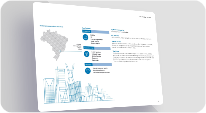 A tale of 44 cities | Sao Paulo S e l f e v a u l a t i o n o f tH h eu hb u bi in nd i sc High Rankixa t ko e yr s a r e a Sao Paulos Best workspace and accelerators Hub features Top FinTech companies Hub profile Technologies Guia Bolso, Nubank and Creditas. Me xic Big investors o Mobile CitG Kaszek Ventures, Redpoint eVentures, 500 Startups, QED Investors and the IFC. Joyo UX hv ae nr nn Payments gateways esm be Success stories Gn l uo b a l F Social media it rgCn es n t r Seu Nubank is one of the best cases, they raised more than $130m with VC investors, 5p ao1p Data analytics Pao ulr Oxigênio have grown at a spectacular rate since 2013 and are one of the most loved ot Startup Farm companies from the financial sector in Brazil. Wayra Innovation areas Jaka Cubo The Brazilian FinTech Scene is booming. With around 220 startups and rta Retail banking The future VC investment reaching US$161 million in 2016, Brazil currently has Robo advisors The Brazilian ecosystem will continue to grow in the next 12 months, with the nDIn addition of new spaces such as WeWork. We expect to see incumbents work with o1Bon Online lending i2ui more FinTechs and FinTech investment than any other country in Latin tINDEX SCORE3sno IT companies to attract talent and create more programmes to interact with local aingv vea Treasury ost FinTechs. We also expect to see further advances from Brazilian regulators. America. In the last couple of years, many of the country's financial nsi o n I ln Payments institutions have invested in FinTech by providing investments, support aboxed9uc There are challenging but exciting times ahead! and workings spaces. The Brazilian financial authorities are watching lGnI6243rutl this sector closely and are studying regulatory models from other parts e Challenges of the world to further create their own regulation in this field.Low Rank Regulatory uncertainty Regulatory barriers Limited exit opportunities tise Reper gulao ex tionty t imi rox Hub representativeP Fintech Committee at AB Startupsrs Foreigstome CEOn startupity to cu Bruno DinizsProxim 61