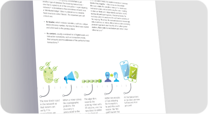 To start a new section, hold down the apple+shift keys and click to release this object and type the section title in the box below. What is in a blockchain? Given the latest block, it is possible to access all previous Despite its apparent complexity, a blockchain is just blocks linked together in the chain, so a blockchain another type of database for recording transactions – database retains the complete history of all assets and one that is copied to all of the computers in a participating instructions executed since the very first one – making network.21 A blockchain is thus sometimes referred to as its data verifiable and independently auditable. As the a ‘distributed ledger’. Data in a blockchain is stored in number of participants grows, it becomes harder for fixed structures called ‘blocks’. The important parts of malicious actors to overcome the verification activities of a block are: the majority. Therefore the network becomes increasingly robust and secure. Indeed, blockchain solutions are being • its header, which includes metadata, such as a unique planned to protect data from the UK’s nuclear power block reference number, the time the block was created stations, flood-defence mechanisms and other critical and a link back to the previous block infrastructure.23 • its content, usually a validated list of digital assets and instruction statements, such as transactions made, their amounts and the addresses of the parties to those transactions.22 Figure 1. How the Bitcoin blockchain works Bob owes Alice To pay her, he Bob gets Alice’s The app alerts The miners verify any transactions The new block is put …hen a miner solves The algorithm …ithin ten minutes All the transactions money for lunch.needs two piecespublic key by Bitcoin ‘miners’ that Bob has occur in the network in the network so the cryptographic rewards theof Bob initiatingin the block are now He installs an appof information: scanning a code around the world of enough bitcoins to at any time. All the that miners can problem, the winning miner with the transaction,fulfilled and Alice on his smartphone his private key and from her phone, or the impending make the payment.pending transactions verify if its discovery is †‡ bitcoins, and the he and Alice each gets paid. to create a new her public key.by having her email transaction. ‘iners’ in a given timeframe transactions are announced to the new block is added receive the first Bitcoin wallet.him the payment provide transaction are grouped inlegitimate. rest of the network.to the front ofconfirmation that A wallet app is like a address, a string of verification services.a block for ƒerification is the blockchain.the bitcoin was mobile banking app seemingly random verification. €ach accomplished by €ach block ˆoins signed over to her. and a wallet is like a numbers and block has a uni‚ue completing comple„ the prior block so bank account.letters.identifying number, cryptographic a chain is made – creation time and computations. the blockchain. reference to the previous block. Anyone who has a public key can send money to a Bitcoin address, but only a signature generated by the private key can release money from it. †’ Šraphic: ‹eloitte Œniversity Žress. ‘ource: American Banker Blockchain Enigma. Paradox. Opportunity 5