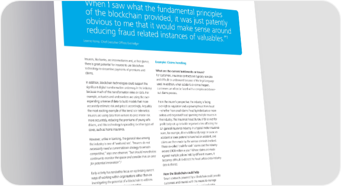 To start a new section, hold down the apple+shift keys and click Document Variables to release this object and type the section title in the box below. Document Title Template Document Subtitle Subtitle Blockchain applications in insurance “ When I saw what the fundamental principles of the blockchain provided, it was just patently obvious to me that it would make sense around 1 reducing fraud related instances of valuables.” Leanne Kemp, Chief Executive Officer, Everledger Insurers, like banks, are intermediaries and, at first glance, Example: Claims handling there is great potential for insurers to use blockchain technology to streamline payments of premiums and What are the current bottlenecks or issues? claims. For customers, insurance contracts are typically complex and difficult to understand because of the legal language In addition, blockchain technologies could support the used. In addition, when accidents or crimes happen, significant digital transformation underway in the industry customers can often be faced with a complex and drawn- because much of this transformation relies on data. For out claims process. example, actuaries and underwriters are using the ever- expanding universe of data to build models that more From the insurer’s perspective, the industry is facing accurately estimate risk and price it accordingly. Arguably ever-tighter regulation and a growing threat from fraud the most exciting example of this trend is in telematics: – whether from small-claims fraud by individuals or more insurers are using data from sensors to price motor risk serious and organised fraud spanning multiple insurers in more accurately, reducing the premiums of young safe the industry. The Insurance Fraud Bureau (IFB) is a not-for- drivers, and this technology is spreading to other types of profit body set up to tackle organised crime affecting the cover, such as home insurance. UK general insurance industry. In a typical motor insurance scam, for example, drivers deliberately stage or cause an However, unlike in banking, the general view among accident or even pretend to have had an accident, and the industry is one of ‘wait and see’. “Insurers do not claims are then made by the various criminals involved. necessarily need a current Bitcoin strategy to remain These so-called ‘crash for cash’ scams cost the industry 4 competitive,” says one observer, “but should nonetheless around £400 million a year. Where claims are made continue to monitor the space and consider it as an area against multiple policies held by different insurers, it 2 for potential innovation”. becomes difficult to detect the fraud unless cross-industry data is shared. Early activity has tended to focus on optimising current ways of working within organisations rather than on How the blockchain could help investigating the potential of a blockchain to address Smart contracts powered by a blockchain could provide industry-wide problems and opportunities. customers and insurers with the means to manage claims in a transparent, responsive and irrefutable Everledger, for example, uses the blockchain to create a manner. Contracts and claims could be recorded onto distributed ledger that records details of precious stones a blockchain and validated by the network, ensuring 3 like diamonds. This ledger allows insurers (as well as only valid claims are paid. For example, the blockchain potential purchasers) to check the history of any individual would reject multiple claims for one accident because stone, including previous claims that have been made, the network would know that a claim had already been helping insurers prevent, detect and counter fraud. made. Smart contracts would also enforce the claims – for instance, triggering payments automatically when certain conditions are met (and validated). J3975_BlockchainInsert.indd 3 15/01/2016 17:00