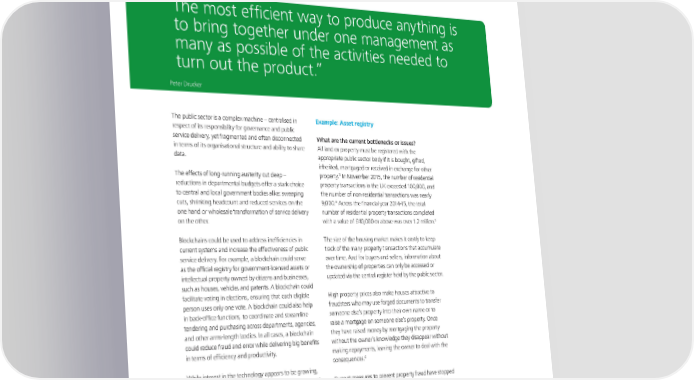 To start a new section, hold down the apple+shift keys and click Document Variables to release this object and type the section title in the box below. Document Title Template Document Subtitle Subtitle Blockchain applications in the public sector “ The most efficient way to produce anything is to bring together under one management as many as possible of the activities needed to turn out the product.” Peter Drucker The public sector is a complex machine – centralised in Example: Asset registry respect of its responsibility for governance and public service delivery, yet fragmented and often disconnected What are the current bottlenecks or issues? in terms of its organisational structure and ability to share All land or property must be registered with the data. appropriate public sector body if it is bought, gifted, inherited, mortgaged or received in exchange for other 3 The effects of long-running austerity cut deep – property. In November 2015, the number of residential reductions in departmental budgets offer a stark choice property transactions in the UK exceeded 100,000, and to central and local government bodies alike: sweeping the number of non-residential transactions was nearly 4 cuts, shrinking headcount and reduced services on the 9,000. Across the financial year 2014-15, the total one hand or wholesale transformation of service delivery number of residential property transactions completed 5 on the other. with a value of £40,000 or above was over 1.2 million. Blockchains could be used to address inefficiencies in The size of the housing market makes it costly to keep current systems and increase the effectiveness of public track of the many property transactions that accumulate service delivery. For example, a blockchain could serve over time. And for buyers and sellers, information about as the official registry for government-licensed assets or the ownership of properties can only be accessed or intellectual property owned by citizens and businesses, updated via the central register held by the public sector. such as houses, vehicles and patents. A blockchain could facilitate voting in elections, ensuring that each eligible High property prices also make houses attractive to person uses only one vote. A blockchain could also help fraudsters who may use forged documents to transfer in back-office functions, to coordinate and streamline someone else’s property into their own name or to tendering and purchasing across departments, agencies, raise a mortgage on someone else’s property. Once and other arms-length bodies. In all cases, a blockchain they have raised money by mortgaging the property could reduce fraud and error while delivering big benefits without the owner’s knowledge they disappear without in terms of efficiency and productivity. making repayments, leaving the owner to deal with the 6 consequences. While interest in the technology appears to be growing, public sector applications using the blockchain are, as yet, Current measures to prevent property fraud have stopped rare. The government in Honduras, for example, kicked-off fraudulent applications on properties worth more than 7 a project last year with Factom to reduce fraud in its public £74 million. The challenge, though, is that property land registry by moving data onto a distributed ledger, but fraud is not easily detected so the responsibility falls on 1 this project has apparently stalled. And BitHealth, a US all parties, including home owners, the government, start-up, is investigating use of the Bitcoin blockchain to solicitors and mortgage lenders. And with interest rates store and transmit healthcare records securely to make it likely to rise in the future, the level of fraud may increase – 8 easier for patients to receive treatment wherever they are leaving more people to pick up the bill. 2 in the world. These are early days, though, and almost every part of the public sector could benefit in some way from blockchain technology. J3975_BlockchainInsert.indd 5 15/01/2016 17:00