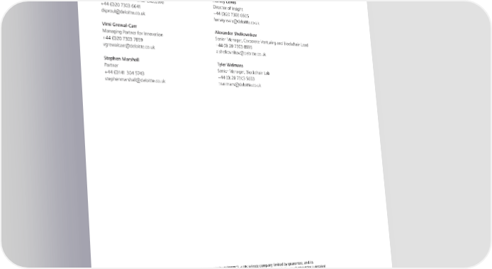 Contacts David Sproul Harvey Lewis Senior Partner and Chief Executive Director of Insight +44 (0)20 7303 6641 +44 (0)20 7303 6805 [email protected] [email protected] Vimi Grewal-Carr Alexander Shelkovnikov Managing Partner for Innovation Senior Manager, Corporate Venturing and Blockchain Lead +44 (0)20 7303 7859 +44 (0) 20 7303 8895 [email protected] [email protected] Stephen Marshall Tyler Welmans Partner Senior Manager, Blockchain Lab +44 (0)141 304 5743 +44 (0) 20 7303 5653 [email protected] [email protected] Deloitte refers to one or more of Deloitte Touche Tohmatsu Limited (“DTTL”), a UK private company limited by guarantee, and its network of member firms, each of which is a legally separate and independent entity. Please see www.deloitte.co.uk/about for a detailed description of the legal structure of DTTL and its member firms. Deloitte LLP is the United Kingdom member firm of DTTL. This publication has been written in general terms and therefore cannot be relied on to cover specific situations; application of the principles set out will depend upon the particular circumstances involved and we recommend that you obtain professional advice before acting or refraining from acting on any of the contents of this publication. Deloitte LLP would be pleased to advise readers on how to apply the principles set out in this publication to their specific circumstances. Deloitte LLP accepts no duty of care or liability for any loss occasioned to any person acting or refraining from action as a result of any material in this publication. © 2016 Deloitte LLP. All rights reserved. Deloitte LLP is a limited liability partnership registered in England and Wales with registered number OC303675 and its registered office at 2 New Street Square, London EC4A 3BZ, United Kingdom. Tel: +44 (0) 20 7936 3000 Fax: +44 (0) 20 7583 1198. Designed and produced by The Creative Studio at Deloitte, London. J3980