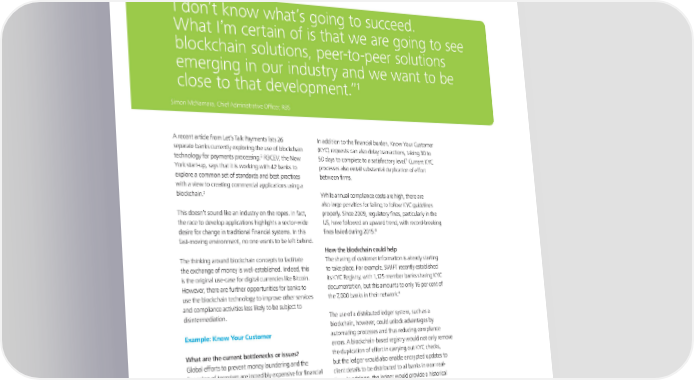 Blockchain applications in banking “ I don’t know what’s going to succeed. What I’m certain of is that we are going to see blockchain solutions, peer-to-peer solutions emerging in our industry and we want to be 1 close to that development.” Simon McNamara, Chief Administrative Officer, RBS A recent article from Let’s Talk Payments lists 26 In addition to the financial burden, Know Your Customer separate banks currently exploring the use of blockchain (KYC) requests can also delay transactions, taking 30 to 2 7 technology for payments processing. R3CEV, the New 50 days to complete to a satisfactory level. Current KYC York start-up, says that it is working with 42 banks to processes also entail substantial duplication of effort explore a common set of standards and best practices between firms. with a view to creating commercial applications using a 3 blockchain. While annual compliance costs are high, there are also large penalties for failing to follow KYC guidelines This doesn’t sound like an industry on the ropes. In fact, properly. Since 2009, regulatory fines, particularly in the the race to develop applications highlights a sector-wide US, have followed an upward trend, with record-breaking desire for change in traditional financial systems. In this fines levied during 2015.8 fast-moving environment, no one wants to be left behind. How the blockchain could help The thinking around blockchain concepts to facilitate The sharing of customer information is already starting the exchange of money is well-established. Indeed, this to take place. For example, SWIFT recently established is the original use-case for digital currencies like Bitcoin. its KYC Registry, with 1,125 member banks sharing KYC However, there are further opportunities for banks to documentation, but this amounts to only 16 per cent of 9 use the blockchain technology to improve other services the 7,000 banks in their network. and compliance activities less likely to be subject to disintermediation. The use of a distributed ledger system, such as a blockchain, however, could unlock advantages by Example: Know Your Customer automating processes and thus reducing compliance errors. A blockchain-based registry would not only remove What are the current bottlenecks or issues? the duplication of effort in carrying out KYC checks, Global efforts to prevent money laundering and the but the ledger would also enable encrypted updates to financing of terrorism are incredibly expensive for financial client details to be distributed to all banks in near real- firms to maintain. In 2014, it was estimated that global time. In addition, the ledger would provide a historical spending on Anti-Money Laundering (AML) compliance record of all documents shared and compliance activities 4 alone amounted to $10 billion. The banks are coming undertaken for each client. This record could be used to under pressure from investors and analysts to reduce provide evidence that a bank has acted in accordance costs, but many expect the budgets for their compliance with the requirements placed upon it should regulators teams to increase in the coming years rather than ask for clarification. It would also be of particular use decrease.5, 6 in identifying entities attempting to create fraudulent histories. Subject to the provisions of data protection regulation, the data within it could even be analysed by the banks to spot irregularities or foul play – directly targeting criminal activity. J3975_BlockchainInsert.indd 1 15/01/2016 17:00