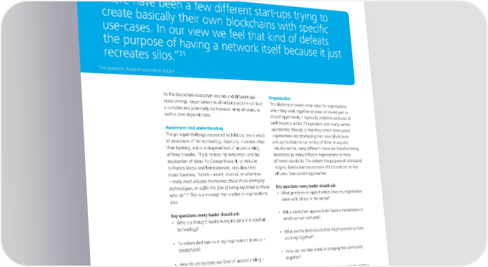To start a new section, hold down the apple+shift keys and click to release this object and type the section title in the box below. Key challenges “ There have been a few different start-ups trying to create basically their own blockchains with specific use-cases. In our view we feel that kind of defeats the purpose of having a network itself because it just 31 recreates silos.” Tim Swanson, head of research at R3CEV As the blockchain ecosystem evolves and different use- Organisation cases emerge, organisations in all industry sectors will face The blockchain creates most value for organisations a complex and potentially controversial array of issues, as when they work together on areas of shared pain or well as new dependencies. shared opportunity – especially problems particular to each industry sector. The problem with many current Awareness and understanding approaches, though, is that they remain stove-piped: The principal challenge associated with blockchain is a lack organisations are developing their own blockchains of awareness of the technology, especially in sectors other and applications to run on top of them. In any one than banking, and a widespread lack of understanding industry sector, many different chains are therefore being of how it works. This is hampering investment and the developed by many different organisations to many exploration of ideas. As George Howard, contributor different standards. This defeats the purpose of distributed to Forbes Media and Entertainment, says about the ledgers, fails to harness network effects and can be less music business, “Artists – visual, musical, or otherwise efficient than current approaches. – really must educate themselves about these emerging technologies, or suffer the fate of being exploited by those Key questions every leader should ask: 32 who do”. This is a message that applies to organisations, • What problems or opportunities does my organisation also. share with others in the sector? Key questions every leader should ask: • Will a blockchain approach still leave a marketplace in • Who is a thought leader in my industry in blockchain which we can compete? technology? • What are the bottlenecks that might prevent us from • To whom do I turn to in my organisation to explain working together? blockchains? • How can we take a lead in bringing the community • How do we increase our level of understanding – together? at all levels? • How many organisations would be needed to create a • Is a blockchain right for my organisation? And, if so, critical mass? how are we thinking about applying it and what would this mean organisationally and culturally? • What are the common standards we require? • With whom do I interact within my organisation to collaborate and deliver? • What are my competitors and peers saying about blockchain? 10