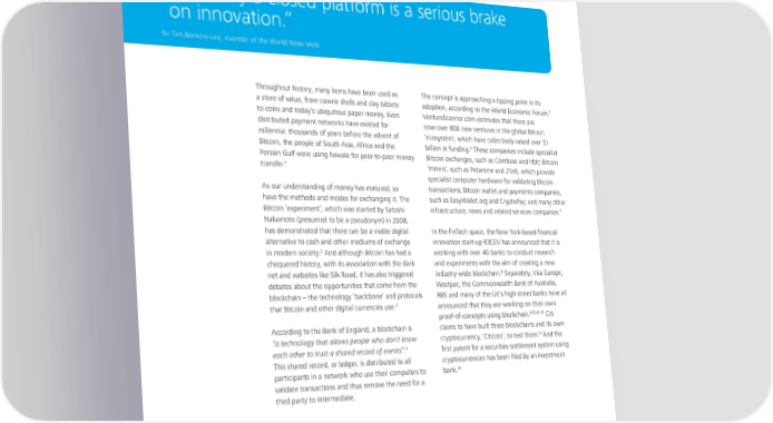 To start a new section, hold down the apple+shift keys and click to release this object and type the section title in the box below. Introduction “ Obviously a closed platform is a serious brake on innovation.” Sir Tim Berners-Lee, inventor of the World Wide Web Throughout history, many items have been used as The concept is approaching a tipping point in its 5 a store of value, from cowrie shells and clay tablets adoption, according to the World Economic Forum. to coins and today’s ubiquitous paper money. Even VentureScanner.com estimates that there are distributed payment networks have existed for now over 800 new ventures in the global Bitcoin millennia: thousands of years before the advent of ‘ecosystem’, which have collectively raised over $1 6 Bitcoin, the people of South Asia, Africa and the billion in funding. These companies include specialist Persian Gulf were using hawala for peer-to-peer money Bitcoin exchanges, such as Coinbase and Itbit; Bitcoin 1 transfer. ‘miners’, such as Petamine and 21e6, which provide specialist computer hardware for validating Bitcoin As our understanding of money has matured, so transactions; Bitcoin wallet and payments companies, have the methods and modes for exchanging it. The such as EasyWallet.org and CryptoPay; and many other 7 Bitcoin ‘experiment’, which was started by Satoshi infrastructure, news and related services companies. Nakamoto (presumed to be a pseudonym) in 2008, has demonstrated that there can be a viable digital In the FinTech space, the New York-based financial alternative to cash and other mediums of exchange innovation start-up R3CEV has announced that it is 2 in modern society. And although Bitcoin has had a working with over 40 banks to conduct research chequered history, with its association with the dark and experiments with the aim of creating a new net and websites like Silk Road, it has also triggered industry-wide blockchain.8 Separately, Visa Europe, debates about the opportunities that come from the Westpac, the Commonwealth Bank of Australia, blockchain – the technology ‘backbone’ and protocols RBS and many of the UK’s high street banks have all that Bitcoin and other digital currencies use.3 announced that they are working on their own 9,10,11,12 proof-of-concepts using blockchain. Citi According to the Bank of England, a blockchain is claims to have built three blockchains and its own 13 “a technology that allows people who don’t know cryptocurrency, ‘Citicoin’, to test them. And the each other to trust a shared record of events”.4 first patent for a securities settlement system using This shared record, or ledger, is distributed to all cryptocurrencies has been filed by an investment 14 participants in a network who use their computers to bank. validate transactions and thus remove the need for a third party to intermediate. 2