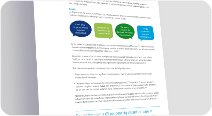 Rogers also simplified billing and provided clearer visibility into data and account usage. This kind of personalization and simplicity helps customers and helps the frontline team to deliver a better service experience. Additionally, Rogers upgraded their website experience so customers can execute online payments, updates to payment methods, wireless add-ons, new activations of residential and wireless services, hardware upgrades, price plan changes and more. Results As Rogers enters the second year of Rogers 3.0, it has succeeded in delivering results in a highly competitive market. Customer feedback about Messenger support has been very positive to date. It was great I really like the The service Service to get such quick I received via is excellent responses Facebook chat Facebook messenger now with via Facebook support option was exemplary Facebook chat By December 2015, Rogers had 70,000 customer interactions on Facebook and Messenger (75 per cent of all social channel customer engagement). As the company continues to invest in personalized, online and self-service options, 17 contact volumes have declined by almost 13 per cent in 2015. For context, a survey of US call center managers and directors reported the median cost of an inbound call was 18 $4.50 per call in 2014. In switching to online tools like Messenger, call center employees can handle multiple interactions at one time, thereby likely reducing call center operating costs and improving productivity. The improvements made to customer experience have yielded positive results: • Rogers has seen a 65 per cent significant increase in partner channel customer satisfaction metrics since the introduction of Messenger • The Commissioner for Complaints for Telecommunications Services (CCTS) reported a 65 per cent decrease in customer complaints between August 2015 and January 2016 compared to the previous six months (and down 19,20 50 per cent over the past two and a half years). This decreased faster than all key competitors. Additionally, Rogers has been committed to digital channel support since 2009, and was the first operator in Canada to launch an online discussion forum. Rogers Community Forums was awarded Lithium’s ‘Total Community All Star’ 21 Award in 2015; ahead of 66 other entrants from 17 countries across four continents and representing 47 brands. Rogers has seen a 65 per cent significant increase in partner channel customer satisfaction metrics since the introduction of Messenger. 6