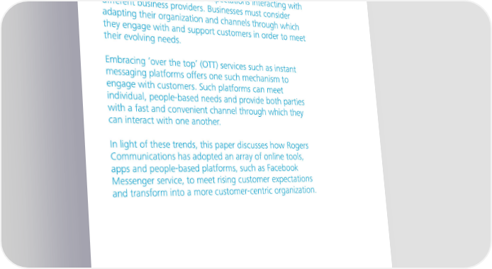 Abstract The rapid growth and use of smartphones has changed customer behavior and their expectations interacting with different business providers. Businesses must consider adapting their organization and channels through which they engage with and support customers in order to meet their evolving needs. Embracing ‘over the top’ (OTT) services such as instant messaging platforms offers one such mechanism to engage with customers. Such platforms can meet individual, people-based needs and provide both parties with a fast and convenient channel through which they can interact with one another. In light of these trends, this paper discusses how Rogers Communications has adopted an array of online tools, apps and people-based platforms, such as Facebook Messenger service, to meet rising customer expectations and transform into a more customer-centric organization. Digital transformation for telecom operators Adapting to a customer-centric, mobile-first world 1