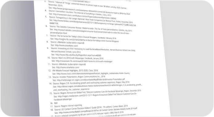 Endnotes 1. Source: In Canada, Mobile Drives Significant Gains in Time Spent with Media, eMarketer, May 2015 See: http://www.emarketer.com/Article/Canada-Mobile-Drives-Significant-Gains-Time-Spent-with-Media/1012535 2. Sour ce: Gartner Says 6.4 Billion Connected “Things” Will Be in Use in 2016, Up 30 Percent from 2015, Gartner, November 2015 See: http://www.gartner.com/newsroom/id/3165317 3. Sour ce: ‘Internet of Things’ connected devices to almost triple to over 38 billion units by 2020, Gartner, November, 2015 See: http://www.juniperresearch.com/press/press-releases/iot-connected-devices-to-triple-to-38-bn-by-2020 4. Sour ce: Connection Counters: The Internet of Everything in Motion, Cisco, 2013 See: http://newsroom.cisco.com/feature-content?type=webcontent&articleId=1208342 5. Sour ce: Transparency Is No Longer Optional: How Food Companies Can Restore Trust, Forbes, November 2015 See: http://www.forbes.com/sites/gmoanswers/2015/11/30/transparency-no-longer-optional/#2715e4857a0b37d6 da847705 6. Sour ce: The Deloitte Consumer Review: Made-to-order: The rise of mass personalization, Deloitte, July 2015 See: http://www2.deloitte.com/uk/en/pages/consumer-business/articles/made-to-order-the-rise-of-mass- personalisation.html 7. Sour ce: The M-Factor for Today’s Omni-Channel Shoppers, Facebook, February 2016 See: http://insights.fb.com/2016/02/04/the-m-factor-for-todays-omni-channel-shoppers/ 8. Sour ce: eMarketer (subscription required) See: http://www.emarketer.com/ 9. Sour ce: Innovating at AT&T: Partnering to Lead the Broadband Revolution, Harvard Business School Case Study, Harvard Business School, June 2012 See: http://www.hbs.edu/faculty/Pages/item.aspx?num=42685 10. Sour ce: Here’s to 2016 with Messenger, Facebook, January 2016 See: http://newsroom.fb.com/news/2016/01/heres-to-2016-with-messenger/ 11. Source: eMarketer (subscription required) See: http://www.emarketer.com/ 12. VNI Mobile F orecast Highlights, 2015-2020, Cisco, 2016 See: http://www.cisco.com/c/dam/assets/sol/sp/vni/forecast_highlights_mobile/index.html#~Country 13. Sour ce: Investor Presentation, Rogers Communications Inc., 2016 See: http://netstorage-ion.rogers.com/downloads/IR/pdf/slide-deck/Investor-Presentation.pdf 14. Sour ce: Rogers 3.0: Accelerating growth and overhauling customer experience, Rogers, May 2014 See: http://about.rogers.com/about/news-media-relations/news/item/2014/05/23/rogers_3_0_accelerating_growth_ and_overhauling_the_customer_experience 15. Sour ce: Rogers Announces Global First, Telecom Customer Care On Facebook Messenger, Rogers, December 2015 See: http://rogers.mediaroom.com/2015-12-11-Rogers-Announces-Global-First-Telecom-Customer-Care-On- Facebook-Messenger 16. Ibid 17. Source: Rogers internal reporting 18. Sour ce: US Contact Center Decision-Makers’ Guide (2014 - 7th edition), Contact Babel, 2014 See: http://www.contactbabel.com/pdfs/apr2014/The US Contact Center Decision-Makers Guide 2014.pdf 19. Rogers r educed complaints by 65 per cent in CCTS mid-year report, CNW, March 2016 See: http://www.newswire.ca/news-releases/rogers-reduces-complaints-by-65-per-cent-in-ccts-mid-year- report-573956741.html 20. Sour ce: Rogers Communications Reports Fourth Quarter 2015 Results, Rogers, December 2015 See: http://netstorage-ion.rogers.com/downloads/IR/pdf/quarterly-results/Rogers-2015-Q4-Results-Release.pdf 21. Source: Rogers internal reporting Digital transformation for telecom operators Adapting to a customer-centric, mobile-first world 9