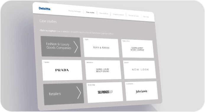 The big challenges Case studies Our wardrobe Insight & research The way we work Next steps Case studies Click to explore how a selection of world’s leading brands have taken journeys with us Digital uly chain ‚ashion ‡ Luˆury GLOBAL LUU Goods Co†anies GOOD COA ‚inance €nnovation Growth GLOBAL LUU B„AUƒ BA D ƒechnology „…co††erce etailers