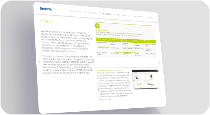 The big challenges Case studies Our wardrobe Insight & research The way we work Next steps Anayi†s H‚ˆ ˆ c‹ ‰ l† We are isru€inƒ he …arke€a†e by e…beinƒ Whie here’s no sinƒe ans„er o he uesion o‚ „here o sar „ih anayi†s „e beiee hese areas shou be on he shor is ‚or any uxury business anayi†s in eeryhinƒ „e o Throuƒh a unreeninƒ ‚o†us on “hear o‚ he business” issues „e are he€inƒ CŠ€‚’ … ‚ˆ‰ Ri€k … Šl‚Ž W‚kŒ‚c —i‹‹c SІ†lŽ c‰i‹ our †iens o rans‚or… he…sees eierinƒ a –ricing & profitability Regulation & –erformance Šinancial performance upplier & procurement “o…ino e‚‚e†” riinƒ ao€ion hrouƒhou heir compliance management management analysis business ‚ro… he ineƒraion o‚ our aan†e Customer segmentation Šraud & forensics ›orkforce alignment ‘danced forecasting upply chain †a€abiiies inusry ex€erise innoaie eiery optimisation …oes an aue˜base ou†o…es Brand & sentiment Reputational risk Compensation & Tax model –roduct profitability analysis benefits optimisation The e€h an breah o‚ †a€abiiies is unriae – no oher ‚ir… has he †o…binaion o‚ anayi†s e†hnooƒy †a€abiiies o…ain ex€erise aan†e anayi†s oƒeher „ih reaionshi€s „ih –xŒ an business o„ners We hae oer §000 anayi†s €ro‚essionas ƒobay „orkinƒ in †oaboraion „ih our 1ž000 ei†ae T‰ —€‰i‚‹ I‹ lli ‹c Acc l ‚ eiery ne„ork o eier ƒreaer insiƒh o you We hae inese o †reae a uni ue se o‚ ‚ashion ineiƒen†e an anayi†s oos An exa…€e o‚ his is ‚oun „ihin our eainƒ˜eƒe oo ‚or ‚ashion reaiers° kno„ †o…€eiors’ €rou†s €ri†es an is†ouns o …axi…ise he €rofiabiiy o‚ e†isions The ‘Fashion Ineiƒen†e’ A††eeraor is an anayi†s oo ha €roies our reai †iens „ih rea˜i…e †o…€eior ineiƒen†e base on €ubi†ay aaiabe aa ha eas o beer buyinƒ an rainƒ e†isions as „e as beinƒ abe o €rei† he nex bes hinƒ in se†ons
