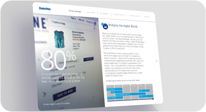 The big challenges Case studies Our wardrobe Insight & research The way we work Next steps 02 ‘riƒinƒ he iƒia iie Many uxury brans are si uesioninƒ ho„ o briƒe he ‘iƒia iie’ I is a ery ei†ae €ah o rea ƒien „ha’s a sake – he bran heriaƒe An his €ah „i i…€a† …ore han ‹us onine reenue iƒia e†hnooƒies hae re†eny been esi…ae o influen†e oer a hir o‚ ƒoba in˜sore reai saes We hink ha nu…ber is ikey o ƒro„ o ž0Ÿ urinƒ 201ž This a††eeraion …eans a i€€inƒ €oin in uxury reai „here iƒia †an no onƒer be †onsiere a Ÿ isin† business insea i „i in†reasinƒy be†o…e ‚una…ena o orƒanisaions an he enire †onsu…er˜ bran reaionshi€ Any iƒia …ani‚esaion o‚ he bran – ‚ro… so†ia €a‚or…s o hir €ary isribuors – —0 nees o be synony…ous o he bran †ore aues an be aiore o he nees o‚ he †uso…er o‚ isiors use iƒia ‚or sho€€inƒ˜ A …isaiƒne or ƒeneri† iƒia o‚‚erinƒ …ay a†uay reae a†iiies be‚ore or urinƒ „ien he iƒia iie heir …os re†en ri€ o a sore –onsier iƒia inera†ion €oins a†ross he „hoe i‚e†y†e AWARE CONSIDER EVALUATE PURCHASE LOYALTY RECOEND Diil A € S‚cil S‚cil W ƒ€i „ ‚ƒil … Tƒl A†† Diil Ei‚il CR The New €igital €iide †‡ˆ‰ €eloitte