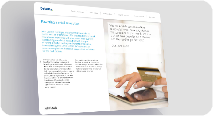 The big challenges Case studies Our wardrobe Insight & research The way we work Next steps owering a retail revolution “ Ÿou are acutely conscious of the responsibility you have got, which is the reputation of §the brand¨, the trust ohn œewis is the largest department store retailer in that we have got with our customers the ‡K with an ecommerce offer that sets the benchmark and the need to get that right” for customer experience and proposition. Their business is embarking on a Retail Revolution with the goal of having a market beating omnichannel roposition, ‰ ‘, ohn œewis to enable this ohn œewis needed to implement an ecommerce platform that could support their ambitions for the next decade. €eloitte worked with ohn œewis The result is a world class solution to define the re”uired business and handling hundreds of thousands of technology capabilities and software to customer visits per hour on a website that deliver their business goals we acted as enables ohn œewis to internally manage the implementation partner to replace the launch and turnover of more than their ecommerce platform. ‡sing creative †,„„„ products per week. and technical expertise from across the global €eloitte €igital network, we have implemented new ecommerce software from ‘racle T› and web content management software from dobe ‰¦† to deliver the new customer facing website.