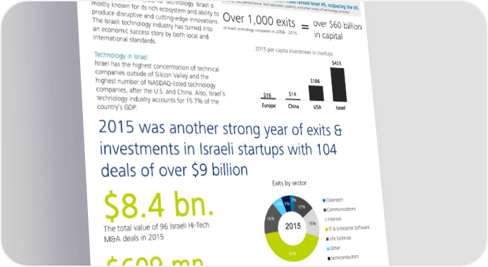 Israel - the world’s 2nd best entrepreneurial ecosystem Israel – The hotspot for disruptive innovation The 2015 Global Startup Ecosystem ranked Tel Aviv 2nd place after the US. For more than a decade Israel in general, and [Criteria: Performance, Funding, Talent, Market Reach, and Startup Experience] the city of Tel Aviv in particular, has positioned The 2015 Bloomberg Innovation Index ranked Israel #5, outpacing the US. itself as a global leader for innovation and of the [Criteria: R&D performance, tech education, patents, and other marks of technology process] faster growing hotspots for technology. Israel is mostly known for its rich ecosystem and ability to Over 1,000 exits = over $60 billion produce disruptive and cutting-edge innovations. The Israeli technology industry has turned into of Israeli technology companies in 2006 - 2015 in capital an economic success story by both local and international standards. 2015 per capita investment in startups $423 Technology in Israel Israel has the highest concentration of technical companies outside of Silicon Valley and the $186 highest number of NASDAQ-listed technology companies, after the U.S. and China. Also, Israel’s $16 $14 technology industry accounts for 15.7% of the Europe China USA Israel country’s GDP. 2015 was another strong year of exits & investments in Israeli startups with 104 deals of over $9 billion Exits by sector 6% 5% 3% Cleantech $8.4 bn. 12% Communications The total value of 96 Israeli Hi-Tech 16% Internet 2015 15% M&A deals in 2015 IT & Enterprise Software Life Sciences 43% Other $609 mn. Semiconductors From IPO activity in 2015 Buyers by geography, M&A deals 6% 3% East Asia 1,400 new startups, 4% 4% UK in 2015, out of which: USA/Canda 30% 2015 Israel 373 received funding over 53% $500K, totaling $3.58 bn. Europe (+62% compared to 2014) Other 12