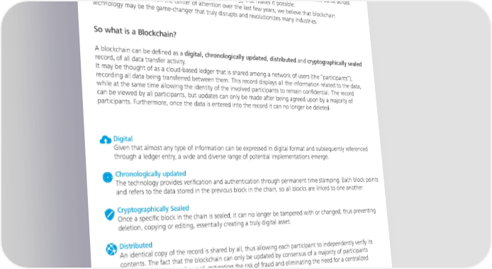 Blockchain, the technology behind Bitcoin, a true game-changer The digital currency ‘Bitcoin’ has been featured in numerous articles and has gained widespread recognition and some might even say notoriety. If you have read up a bit about bitcoin you might have also come across the term ‘Blockchain’, the underlying innovative technology that makes it possible. Although bitcoin has been the center of attention over the last few years, we believe that blockchain technology may be the game-changer that truly disrupts and revolutionizes many industries. So what is a Blockchain? A blockchain can be defined as a digital, chronologically updated, distributed and cryptographically sealed record, of all data transfer activity. It may be thought of as a cloud-based ledger that is shared among a network of users (the “participants”), recording all data being transferred between them. This record displays all the information related to the data, while at the same time allowing the identity of the involved participants to remain confidential. The record can be viewed by all participants, but updates can only be made after being agreed upon by a majority of participants. Furthermore, once the data is entered into the record it can no longer be deleted. Digital Given that almost any type of information can be expressed in digital format and subsequently referenced through a ledger entry, a wide and diverse range of potential implementations emerge. Chronologically updated The technology provides verification and authentication through permanent time stamping. Each block points and refers to the data stored in the previous block in the chain, so all blocks are linked to one another. Cryptographically Sealed Once a specific block in the chain is sealed, it can no longer be tampered with or changed, thus preventing deletion, copying or editing, essentially creating a truly digital asset. Distributed An identical copy of the record is shared by all, thus allowing each participant to independently verify its contents. The fact that the blockchain can only be updated by consensus of a majority of participants provides an inherent safeguard, mitigating the risk of fraud and eliminating the need for a centralized coordinated verification process. Any attempt to gain a majority, manipulate the system and alter its records, could be detected by other participants, consequently discrediting the system and preventing any benefit from being realized. Additionally, due to its dispersed architecture, being shared and duplicated across multiple sites, there is no single point of failure. If one node in the network fails, whether due to attack or outage, the remaining nodes can continue to operate unhindered, ensuring data availability and reliability. 6