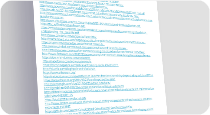 Sources https://bitcoinmagazine.com/articles/400000-people-gradually-adopting-bitcoin-tel-aviv-1433881829; https://www.cryptocoinsnews.com/bitcoin-inevitable-say-israeli-politicians-central-bankers/; http://www.newsbtc.com/2015/09/24/vc-head-believes-israel-will-lead-blockchain-app-industry/ www.economist.com www.forbes.com: “How Bitcoin works” https://www.crunchbase.com/ http://techcrunch.com/2014/07/21/startupbootcamp-fintech-2014-cohort/; http://techcrunch.com/2015/12/19/israels-flourishing-fintech-has-many-fathers/ http://www.israelfintech.com/IsraeliFintechIndustryReview.htm http://www.ivc-online.com/Portals/0/RC/Exits/2015/IVC-Meitar%20Exits%20Report%202015-Final.pdf http://recode.net/2015/07/05/forget-bitcoin-what-is-the-blockchain-and-why-should-you-care/ http://www.extremetech.com/extreme/219651-what-is-blockchain-and-can-ibm-intel-and-big-banks-use-it-to- remake-the-internet http://www.ofnumbers.com/wp-content/uploads/2015/04/Permissioned-distributed-ledgers.pdf http://storj.io/TheBlockchainReport.pdf https://www.barclayscorporate.com/content/dam/corppublic/corporate/Documents/insight/blockchain_ understanding_the_potential.pdf http://www.coindesk.com/companies/ripple-labs/ http://motherboard.vice.com/blog/beyond-bitcoin-a-guide-to-the-most-promising-cryptocurrencies https://ripple.com/knowledge_center/market-makers-2/ http://www.coindesk.com/colored-coins-paint-sophisticated-future-for-bitcoin/ http://bravenewcoin.com/news/ten-companies-using-the-blockchain-for-non-financial-innovation/ http://www.fastcolabs.com/3035723/app-economy/smart-contracts-could-be-cryptocurrencys-killer-app https://docs.erisindustries.com/explainers/ http://mapofcoins.com/technologies/ripple https://bitcoinmagazine.com/articles/introducing-ripple-1361931577 http://bluzelle.com/blog/ripple-and-blockchain https://www.ethereum.org/ http://insidebitcoins.com/news/ethereum-launches-frontier-ether-mining-begins-trading-to-follow/34124 https://blog.ethereum.org/2014/07/22/launching-the-ether-sale/ http://siliconangle.com/blog/2014/04/21/bitcoin-sidechains/ http://gendal.me/2014/10/26/a-simple-explanation-of-bitcoin-sidechains/ https://bitcoinmagazine.com/articles/blockstream-moves-ahead-sidechain-elements-first-implementation- sidechains-1433883105 https://blockstream.com/fact-sheet/ http://www.ibtimes.co.uk/ripple-chief-chris-larsen-sorting-out-payments-will-aid-innovation-securities- settlements-1533687 https://github.com/Colored-Coins/Colored-Coins-Protocol-Specification/wiki/Faq http://www.bitcoinisle.com/2016/02/04/simplex-raises-7-million-for-credit-card-bitcoin-buying-service/ http://www.geektime.co.il/simplex-raises-7m/ Antonopoulos, A. M. (2014). Mastering Bitcoin: unlocking digital cryptocurrencies. O'Reilly Media, Inc. Firstpartner: 2016 The Blockchain Ecosystem 31