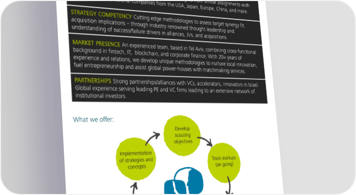 Deloitte Israel – Your bridge to innovation Deloitte Value Proposition: Deloitte Israel is the right partner to connect and integrate startups and innovative Hi-Tech firms with key global players from multiple industries SCOUTING SERVICES Extensive experience and insights from similar assignments with major global multinational companies from the USA, Japan, Europe, China, and more. STRATEGY COMPETENCY Cutting edge methodologies to assess target synergy fit, acquisition implications – through industry renowned thought leadership and understanding of success/failure drivers in alliances, JVs, and acquisitions. MARKET PRESENCE An experienced team, based in Tel Aviv, combining cross-functional background in fintech, IT, blockchain, and corporate finance. With 20+ years of experience and relations, we develop unique methodologies to nurture local innovation, fuel entrepreneurship and assist global power-houses with matchmaking services. PARTNERSHIPS Strong partnerships/alliances with VCs, accelerators, innovators in Israel. Global experience serving leading PE and VC firms leading to an extensive network of institutional investors. What we offer: What we offer: Develop scouting objectives Implementation of strategies and Track startups concepts (on going) Facilitation & supporting POC Screening deal (proof of concept) flow with the client Advising on the right cooperation model 22