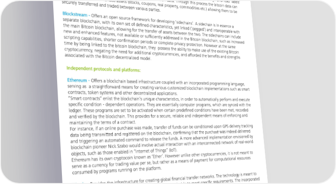 Notable implementations and developments Bitcoin-blockchain dependent: Colored coins - An open source protocol that can utilize the existing Bitcoin protocol for creating specific markers or tokens representing different forms of value or assets. By attaching additional data (‘metadata’) to the data associated with bitcoins it is possible to ‘color’ the coins (or more precisely ‘color’ the bitcoin transaction data) in order to signify alternative value. Specialized wallets allow users to assign and read ‘labels’ which can be attached to the underlying bitcoin transaction data. Through this process the bitcoin data can serve as identifiers for various assets (stocks, coupons, real property, commodities etc.) allowing them to be securely transferred and traded between various parties. Blockstream - Offers an open source framework for developing ‘sidechains’. A sidechain is in essence a separate blockchain, with its own set of defined characteristics, yet linked (‘pegged’) and interoperable with the main Bitcoin blockchain, allowing for the transfer of assets between the two. The sidechains can include new and enhanced features, not available or sufficiently addressed in the Bitcoin blockchain, such as increased scripting capabilities, shorter confirmation periods or complete privacy protection. However at the same time by being linked to the bitcoin blockchain, they possess the ability to make use of the existing Bitcoin cryptocurrency, negating the need for additional cryptocurrencies, and afforded the benefits and strengths associated with the Bitcoin decentralized model. Independent protocols and platforms: Ethereum - Offers a blockchain based infrastructure coupled with an incorporated programming language, serving as a straightforward means for creating various customized blockchain implementations such as smart contracts, token systems and other decentralized applications. “Smart contracts” enlist the blockchain’s unique characteristics, in order to automatically perform and execute specific condition - dependent operations. They are essentially computer programs, which are synced with the ledger. These programs are set to be activated when certain predefined conditions have been met, recorded and verified by the blockchain. This provides for a secure, reliable and independent means of enforcing and maintaining the terms of a contract. For instance, if an online purchase was made, transfer of funds can be conditioned upon GPS delivery tracking data being transmitted and registered on the blockchain, confirming that the purchase was indeed delivered and triggering an automated command to release the funds. A more advanced implementation envisioned by blockchain pioneer Nick Szabo would involve actual interaction with an interconnected network of real-world objects, such as those enabled in “Internet of Things” (IoT). Ethereum has its own cryptocoin known as ‘Ether’. However unlike other cryptocurrencies, it is not meant to serve as a currency for trading value per se, but rather as a means of payment for computational resources consumed by programs running on the platform. Ripple - Provides the infrastructure for creating global financial transfer networks. The technology is meant to be compatible with existing financial systems and customizable to meet specific requirements. The incorporated network contains a distributed ledger which settles transactions through a ‘consensus process’. The process consists of independent servers repeatedly reviewing and comparing transactions and balances, with each iteration requiring an increasing level of certainty, until reaching a 100% consensus on the veracity of the remaining data. An additional element is a ‘path-finding’ algorithm which enables locating the lowest foreign exchange rate across all order books and currency pairs. 29