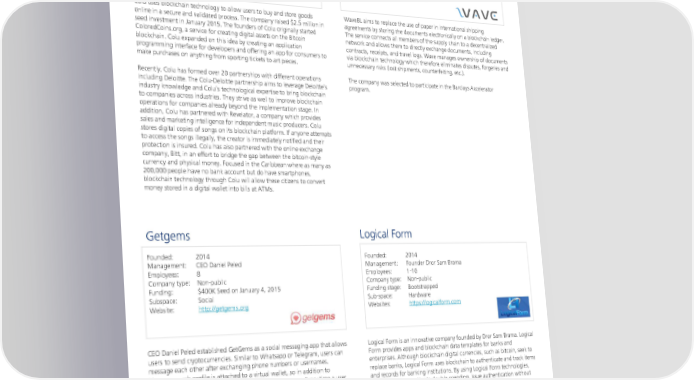 Israeli blockchain – 11 selected startups Colu Wave Founded: 2014, Founded: 2014 Management: CEO Amos Meiri, CTO Rotem Lev, VP of R&D Management: CEO Gadi Ruschin, CTO Or Garbash, VP R&D Yair Sappir David Ring Employees: 1-10 Employees: 13 Company type: Private Company type: Private Funding Stage: Bootstrapped Funding: 2.5 million Sub-space: Other Sub-space: P2P Website: http://wavebl.com Website: www.colu.co Colu uses blockchain technology to allow users to buy and store goods WaveBLaims to replace the use of paper in international shipping online in a secure and validated process. The company raised $2.5 million in agreements by storing the documents electronically on a blockchain ledger. seed investment in January 2015. The founders of Colu originally started The service connects all members of the supply chain to a decentralized ColoredCoins.org, a service for creating digital assets on the Bitcoin network and allows them to directly exchange documents, including blockchain. Colu expanded on this idea by creating an application contracts, receipts, and travel logs. Wave manages ownership of documents programming interface for developers and offering an app for consumers to via blockchain technology which therefore eliminates disputes, forgeries and make purchases on anything from sporting tickets to art pieces. unnecessary risks (lost shipments, counterfeiting, etc.). Recently, Colu has formed over 20 partnerships with different operations The company was selected to participate in the Barclays Accelerator including Deloitte. The Colu-Deloitte partnership aims to leverage Deloitte’s program. industry knowledge and Colu’s technological expertise to bring blockchain to companies across industries. They strive as well to improve blockchain operations for companies already beyond the implementation stage. In addition, Colu has partnered with Revelator, a company which provides sales and marketing intelligence for independent music producers. Colu stores digital copies of songs on its blockchain platform. If anyone attempts to access the songs illegally, the creator is immediately notified and their protection is insured. Colu has also partnered with the online exchange company, Bitt, in an effort to bridge the gap between the bitcoin-style currency and physical money. Focused in the Caribbean where as many as 200,000 people have no bank account but do have smartphones, blockchain technology through Colu will allow these citizens to convert money stored in a digital wallet into bills at ATMs. Getgems Logical Form Founded: 2014 Founded: 2014 Management: CEO Daniel Peled Management: Founder Dror Sam Brama Employees: 8 Employees: 1-10 Company type: Non-public Company type: Non-public Funding: $400K Seed on January 4, 2015 Funding stage: Bootstrapped Subspace: Social Sub-space: Hardware Website: http://getgems.org Websites: https://logicalform.com CEO Daniel Peled established GetGems as a social messaging app that allows Logical Form is an innovative company founded by Dror Sam Brama. Logical users to send cryptocurrencies. Similar to Whatsapp or Telegram, users can Form provides apps and blockchain data templates for banks and message each other after exchanging phone numbers or usernames. enterprises. Although blockchain digital currencies, such as bitcoin, seek to However, each profile is attached to a virtual wallet, so in addition to replace banks, Logical Form uses blockchain to authenticate and track items sending messages users can also transmit virtual currency. Every time a user and records for banking institutions. By using Logical Form technologies, invites someone to download the app, they are rewarded with 25 gems. banks are able to mitigate double spending, issue authentication without Eventually, users will have the opportunity to receive gems for watching identification, and verify digital signatures. advertisements. These gems can be converted to other cryptocurrencies such as bitcoins, gift certificates, or actual dollars depending on the users’ Most companies founded on the Bitcoin blockchain seek to replace the preference. As of October 2015, the app had 15,000 users and raised need of “trusted parties” such as banks or governmental organizations. approximately $1 million in total funding, including investments from Logical Form assumes that these entities are here to stay, and concentrates Magma VC, one of the early investors of the crowd-sourced navigation app on effectively utilizing the blockchain algorithm. Waze. The startup was awarded the title of “most visionary social media solution” at the Citi Mobile Challenge in Europe, the Middle East and Africa out of 750 applicants from 101 countries. Citi described the app as “a solution that could transform financial services.” 18
