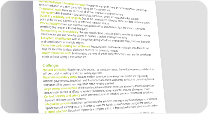 What are the benefits & challenges associated with the implementation of blockchain technology? Benefits Disintermediation & trustless exchange Two parties are able to make an exchange without the oversight or intermediation of a third party, eliminating the counterparty risk Empowered users Users are in control of all their information and transactions High quality data Blockchain data is complete, consistent, timely, accurate, and widely available Durability, reliability, and longevity Due to the decentralized networks, blockchain does not have a central point of failure and is better able to withstand malicious attacks Process integrity Users can trust that transactions will be executed exactly as the protocol commands removing the need of a trusted third party Transparency and immutability Changes to public blockchains are publicly viewable by all parties creating transparency, and can never be altered or deleted, therefore creating immutability Ecosystem simplification With all transactions being added to a single public ledger, it reduces the clutter and complications of multiple ledgers Faster interbank clearing and settlement Previously banks and financial institutions would have to wait days for securities to clear; blockchain shortens this process to minutes Lower transaction costs By eliminating the need of a third party intermediary, users are able to exchange assets without paying a transaction fee Challenges Nascent technology Resolving challenges such as transaction speed, the verification process, and data limits will be crucial in making blockchain widely applicable Uncertain regulatory status Because modern currencies have always been created and regulated by national governments, blockchain and Bitcoin face a hurdle in widespread adoption by pre-existing financial institutions if its government regulation status remains unsettled Large energy consumption The Bitcoin blockchain network’s miners are attempting 450 thousand trillion solutions per second in efforts to validate transactions, using substantial amounts of computer power Control, security, and privacy While some solutions exist, including private or permissioned blockchains, there are still cybersecurity concerns Integration concerns Blockchain applications offer solutions that require significant changes to, or complete replacement of, existing systems. In order to make the switch, companies must strategize the transition Cultural adoption Blockchain represents a complete shift to a decentralized network which requires the buy- in of its users and operators Cost Blockchain offers tremendous savings in transaction costs and time but the high initial capital costs could be a deterrent 10