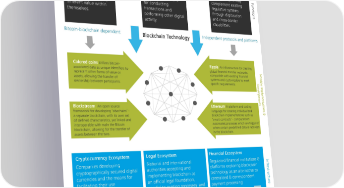 The Blockchain Ecosystem Transfer of Value Security Regulation The blockchain enables The blockchain's Blockchain employs self the transfer of digital permanent tamperproof governance of transfer assets, representing data record affords of ownership. It may F u various manifestations users a secure means complement existing nc t of value or possessing for conducting regulative systems io inherent value within transactions and through digitization ns themselves. performing other digital and cross-border activity. capabilities. Bitcoin-blockchain dependent Blockchain Technology Independent protocols and platforms Colored coins Utilizes bitcoin- Ripple An infrastructure for creating associated data as unique identifiers to global financial transfer networks, N represent other forms of value or compatible with existing financial o t a assets, allowing the transfer of systems and customizable to meet b ownership between participants. D le specific requirements. ev el Im o p pm le m en e t nt s a t Blockstream An open source Ethereum A platform and coding io framework for developing ‘sidechains’ - language for creating individualized ns a separate blockchain, with its own set blockchain implementations such as & of defined characteristics, yet linked and ‘smart contracts’ - computerized interoperable with main the Bitcoin automated processes which are triggered blockchain, allowing for the transfer of when certain predefined data is recorded assets between the two. in the blockchain. Cryptocurrency Ecosystem Legal Ecosystem Financial Ecosystem Companies developing National and international Regulated financial institutions & I n f r cryptographically secured digital authorities accepting and platforms exploring blockchain a s currencies and the means for implementing blockchain as technology as an alternative to tr u facilitating their use an official legal foundation, centralized & correspondent ctu r parallel to existing processes and payment processing e procedures Altcoins Authentication & Authorization Mortgages Exchanges Proof of Ownership (physical & digital assets) Forex Ap Mining E-identity Retail/Commercial Banks p lic ATMs Medical Information Trading & Markets a t Debt cards Cybersecurity Central Banks io Payment Processing Real Estate Credit Card issuers ns P2P IP Money Transfer Operators 9