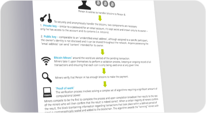 The most widely recognized manifestation of blockchain technology has been the “Bitcoin” Bitcoin, a form of cryptocurrency, was the first truly decentralized digital currency. Bitcoin functions as a P2P system, providing people with the means to transfer value digitally and directly. How does it work? Person A wishes to transfer bitcoins to Person B. To securely and anonymously transfer the bitcoins, two components are necessary: 1. Private key – similar to a password for an email account, it’s kept secret and known only to its owner – only he has access to the account and its contents (i.e. bitcoins). 2. Public key – comparable to an ‘unidentified email address’, although assigned to a specific participant, the owner’s identity is not disclosed and it can be shared throughout the network. Anyone possessing the ‘email address’ can send ‘content’ intended for its owner. Bitcoin Miners’ around the world are alerted of the pending transaction. Miners take it upon themselves to perform a validation process, keeping an ongoing record of all transactions and ensuring that each coin is only being used once at any given time. Miners verify that Person A has enough bitcoins to make the payment. ‘Proof of work’ The verification process involves solving a complex set of algorithms requiring a significant amount of computational power. Miners compete to be the first to complete the process and upon completion broadcast their results to the rest of the miners who will then confirm that the result is indeed correct. When a certain majority of miners confirm the result, the block (containing information regarding transactions that took place within a defined period of time) is cryptographically sealed and added to the blockchain. The algorithm awards the “winning” miners with a certain number of bitcoins. Within 10 minutes of initiating the transaction, Person A and B get a confirmation that the bitcoins were signed over. What about manipulation? Any attempt to manipulate the process by gaining a majority control would necessitate an exorbitant amount of computational power, roughly equal to 13,000 times that of the world’s 500 most powerful supercomputers. 7