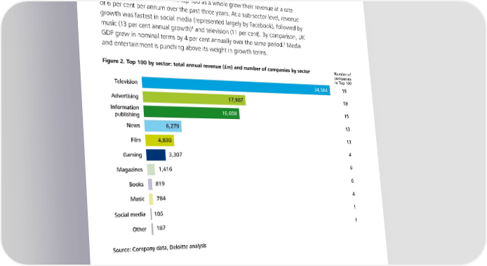 Top growth contributors Our media and entertainment top 100 as a whole grew their revenue at a rate of 6 per cent per annum over the past three years. At a sub-sector level, revenue growth was fastest in social media (represented largely by Facebook), followed by music (13 per cent annual growth)4 and television (11 per cent). By comparison, UK 5 GDP grew in nominal terms by 4 per cent annually over the same period. Media and entertainment is punching above its weight in growth terms. Figure 2. Top 100 by sector: total annual revenue (£m) and number of companies by sector Number of companies in Top 100 Television 34,584 19 Advertising 17,907 18 Information 16,608 15 publishing News 6,279 13 Film 4,830 13 Gaming 3,307 4 Magazines 1,416 6 Books 819 6 Music 784 4 Social media 105 1 Other 187 1 Source: Company data, Deloitte analysis Media Metrics The state of UK media and entertainment 5