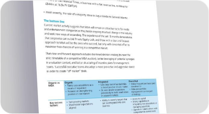 To start a new section, hold down the apple+shift keys and click to release this object and type the section title in the box below. Examples of the premium valuations paid for media assets over the last 12 months, include: • the sale of the Financial Times, a business with a flat revenue line, to Nikkei for £844m at 16.9x PY EBITDA) • most recently, the sale of a majority stake in Argus Media to General Atlantic. The bottom line Current market activity suggests that M&A will remain an attractive tactic for media and entertainment companies as they tackle ongoing structural change in the industry and seek new ways of expanding. The experience of the last 18 months demonstrates that corporates can outbid Private Equity cash, and those with a clear and focused approach to M&A will be the ones who succeed, but only with concerted effort to maximise their chances of winning in a competitive market. That clear and focused approach includes shortened decision-making (to meet the strict timetable of a competitive M&A auction), better leveraging of potential synergies in a valuation context, and better structuring of incentive plans for management teams. Successful executive teams also adopt a more pro-active and aggressive stance in order to create “off market” deals. Organic vs Organic Integrated Diversified M&A • Rarely uses acquisitions as a • Uses large but influential M&A • Makes frequent purchases (and means of expansion to boost position in core market divestments) • Focused on strengthening • Or, uses smaller acquisitions • M&A and portfolio position in core market periodically to build small stakes management is a core part in adjacent markets of strategy Key success • Fast growing markets • Ability to identify targets that • Access to capital factors: • Shareholder expectations can be integrated into core • Strong capabilities in aligned business integrating new acquisitions or managing a portfolio • Operate in makets where scale is important to control costs Challenges • Potentially slower growth • Effective integration of • Extracting value from acquired of this • Can be hard to make big acquired businesses to businesses model: changes to market share ebhance market or product positioning Media Metrics The state of UK media and entertainment 33