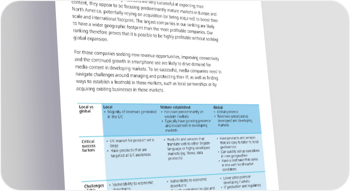 To start a new section, hold down the apple+shift keys and click to release this object and type the section title in the box below. The bottom line While UK-native media organisations are very successful at exporting their content, they appear to be focusing predominantly mature markets in Europe and North America, potentially relying on acquisition (or being acquired) to boost their scale and international footprint. The largest companies in our ranking are likely to have a wider geographic footprint than the most profitable companies. Our ranking therefore proves that it is possible to be highly profitable without seeking global expansion. For those companies seeking new revenue opportunities, improving connectivity and the continued growth in smartphone use are likely to drive demand for media content in developing markets. To be successful, media companies need to navigate challenges around managing and protecting their IP, as well as finding ways to establish a foothold in those markets, such as local partnerships or by acquiring existing businesses in those markets. Local vs Local Mature established Global global • Majority of revenues generated • Focussed predominantly on • Global presence in the UK western markets • Revenues spread across • Typically have growing presence developed and developing and investment in developing markets markets Critical • UK market for product set is • Products and services that • Have products and services success large translate well to other English- that are easy to tailor to local factors • Have products that are language or highly developed preferences targeted at UK audiences markets (eg. News, data • Can quickly set up operations products) in new geographies • Have a cost base that varies in line with local market conditions Challenges • Vulnerability to economic • Vulnerability to economic • Lower price points in of this downturns downturns developing markets model • Growth constrained by size • Growth contrained by size and • IP protection and regulatory and maturity of the market maturity of the market differences • Competitive landscape mature • Competitive landscape mature • Establishing local partnerships and congested and congested or identifying suitable acquisition targets Media Metrics The state of UK media and entertainment 13