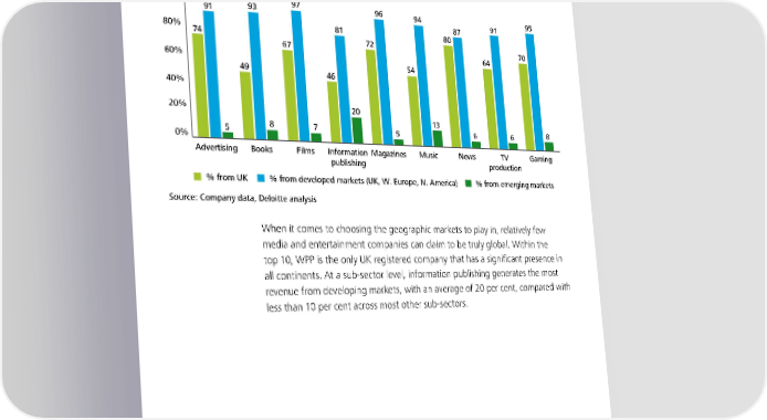 To start a new section, hold down the apple+shift keys and click to release this object and type the section title in the box below. Figure 6. Geographic source of revenues by sector 100% 93 97 96 94 95 91 87 91 80% 81 80 74 72 70 67 64 60% 54 49 46 40% 20% 20 8 13 8 5 7 5 66 0% Advertising Books Films Information Magazines Music News TV Gaming publishing production % from UK % from developed markets (UK, W. Europe, N. America) % from emerging markets Source: Company data, Deloitte analysis When it comes to choosing the geographic markets to play in, relatively few media and entertainment companies can claim to be truly global. Within the top 10, WPP is the only UK registered company that has a significant presence in all continents. At a sub-sector level, information publishing generates the most revenue from developing markets, with an average of 20 per cent, compared with less than 10 per cent across most other sub-sectors. 12