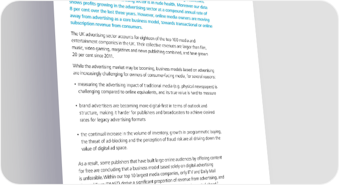 To start a new section, hold down the apple+shift keys and click to release this object and type the section title in the box below. Ad funded vs paid for: where does the money come from? Almost one fifth of the companies in the Top 100 are advertising businesses, suggesting that the UK advertising sector is in rude health. Moreover our data shows profits growing in the advertising sector at a compound annual rate of 8 per cent over the last three years. However, online media owners are moving away from advertising as a core business model, towards transactional or online subscription revenue from consumers. The UK advertising sector accounts for eighteen of the top 100 media and entertainment companies in the UK. Their collective revenues are larger than film, music, video gaming, magazines and news publishing combined, and have grown 20 per cent since 2011. While the advertising market may be booming, business models based on advertising are increasingly challenging for owners of consumer-facing media, for several reasons: • measuring the advertising impact of traditional media (e.g. physical newspapers) is challenging compared to online equivalents, and its true value is hard to measure • brand advertisers are becoming more digital-first in terms of outlook and structure, making it harder for publishers and broadcasters to achieve desired rates for legacy advertising formats • the continual increase in the volume of inventory, growth in programmatic buying, the threat of ad-blocking and the perception of fraud risk are all driving down the value of digital ad space. As a result, some publishers that have built large online audiences by offering content for free are concluding that a business model based solely on digital advertising is unfeasible.Within our top 10 largest media companies, only ITV and Daily Mail General Trust (DMGT) derive a significant proportion of revenue from advertising, and 7 both have warned of ongoing volatility in their ad revenues for the period ahead. Rejecting advertising means embracing a customer-funded business model. Most consumer media sectors took the transactional approach when first going online, creating digital versions of their physical products and business models to download and own. This is still the dominant model today: in 2015, 61 per cent of total consumer spend on music, TV, film and video games in the UK was on physical or download- to-own products. Music is the most popular category for owned products, with download-to-own accounting for 76 per cent of total music sales.8 Media Metrics The state of UK media and entertainment 15
