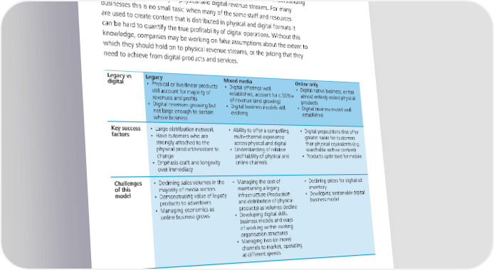 To start a new section, hold down the apple+shift keys and click to release this object and type the section title in the box below. Media and entertainment companies should try to establish a clear understanding of the relative profitability of physical and digital revenue streams. For many businesses this is no small task: when many of the same staff and resources are used to create content that is distributed in physical and digital formats it can be hard to quantify the true profitability of digital operations. Without this knowledge, companies may be working on false assumptions about the extent to which they should hold on to physical revenue streams, or the pricing that they need to achieve from digital products and services. Legacy vs Legacy Mixed media Online only digital • Physical or live/linear products • Digital offerings well • Digital native business, or has still account for majority of established, account for c.50%+ almost entirely exited physical revenues and profits of revenue (and growing) products • Digital revenues growing but • Digital business models still • Digital business model well not large enough to sustain evolving established whole business Key success • Large distribution network • Ability to offer a compelling • Digital propositions that offer factors • Have cutomers who are multi-channel experience greater value for customers strongly attached to the across physical and digital than physical equivalents (e.g. physical product/resistant to • Understanding of relative searchable archive content) change profitability of physical and • Products optimised for mobile • Emphasis craft and longevity online channels over immediacy Challenges • Declining sales volumes in the • Managing the cost of • Declining prices for digital ad of this majority of media sectors maintaining a legacy inventory model • Demonstrating value of legacy infrastructure (Production • Developing sustainable digital products to advertisers and distribution of physical business model • Managing economics as products) as volumes decline online business grows • Developing digital skills, business models and ways of working within existing organisation structures • Managing two (or more) channels to market, operating at different speeds Media Metrics The state of UK media and entertainment 21