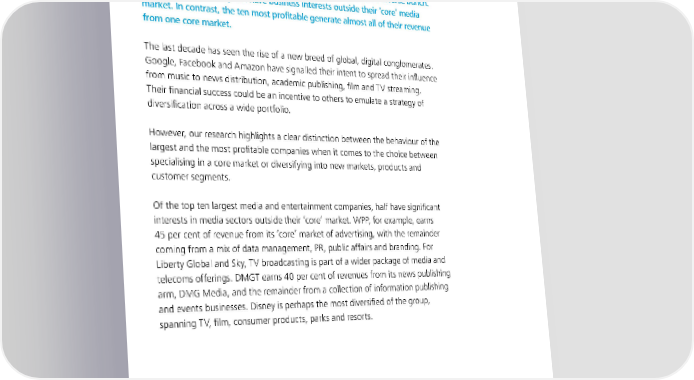 To start a new section, hold down the apple+shift keys and click to release this object and type the section title in the box below. Specialised vs diversified: diversify for revenue, focus for profit The leading media and entertainment companies in the UK are a diverse bunch. The majority of the top ten have business interests outside their ‘core’ media market. In contrast, the ten most profitable generate almost all of their revenue from one core market. The last decade has seen the rise of a new breed of global, digital conglomerates. Google, Facebook and Amazon have signalled their intent to spread their influence from music to news distribution, academic publishing, film and TV streaming. Their financial success could be an incentive to others to emulate a strategy of diversification across a wide portfolio. However, our research highlights a clear distinction between the behaviour of the largest and the most profitable companies when it comes to the choice between specialising in a core market or diversifying into new markets, products and customer segments. Of the top ten largest media and entertainment companies, half have significant interests in media sectors outside their ‘core’ market. WPP, for example, earns 45 per cent of revenue from its ‘core’ market of advertising, with the remainder coming from a mix of data management, PR, public affairs and branding. For Liberty Global and Sky, TV broadcasting is part of a wider package of media and telecoms offerings. DMGT earns 40 per cent of revenues from its news publishing arm, DMG Media, and the remainder from a collection of information publishing and events businesses. Disney is perhaps the most diversified of the group, spanning TV, film, consumer products, parks and resorts. Media Metrics The state of UK media and entertainment 23