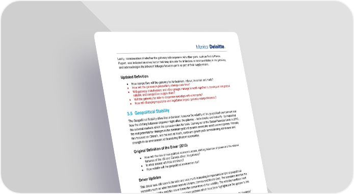 Lastly, consideration of whether the gateway will cooperate with other ports, such as Port of Prince Rupert, was included as a key factor that may alleviate the limitations on land availability in the gateway, and acknowledges the inherent linkages between ports as part of their supply chains. Updated Definition • How competitive will the gateway be for business, labour, investors and trade? • How will the gateway’s productivity change over time? • Will gateway stakeholders and other groups manage to work together to develop an integrated, reliable and competitive supply chain? • Will the gateway be able to cooperate and align with other ports? • How will changing regulation and legislation impact gateway competitiveness? 3.5 Geopolitical Stability The Geopolitical Stability driver has a dominant focus on the volatility of the geopolitical environment and how the shifting balances of power might affect the gateway – both directly and indirectly - by impacting the external markets which the gateway relies for trade. Coming out of the Global Financial Crisis in 2010, the real potential for changes in the dominant political powers across the world was recognized. Primarily this focused on China’s, and the rest of Asia’s, continued growth path demonstrating dominance and strength in an environment of floundering Western economies. Original Definition of the Driver (2010) • How will the rise of new political economic actors, shifting balances of power and the relative fortunes of the US and Canada affect the gateway? • In what arenas will Asia dominate? • How volatile will the geopolitical environment be? Driver Updates This driver was still seen to be valid and very much increasing in importance in light of geopolitical instability such as what has been seen in Ukraine, Crimea and Middle East. The scenarios describe the concept of volatility and this driver forms the cornerstone of that volatility. The volatility manifests itself through the global energy markets and trade patterns which have been highlighted in the updates to this driver. Asia continues to be perceived as critically important in this driver, however, whether it would “dominate” was not seen as a given. This uncertainty was reframed to consider what roles the various countries within Asia would play in the evolving geopolitical environment along with the role that Asia overall would play in trade globally. Another critical theme seen to be a major uncertainty is the impact increasingly uneven distribution of wealth across the world will have on stability. It is a relative certainty that it will continue to be uneven, at least for a time, but how it will play out and its impacts are unclear. Updated Definition • How will the rise of new political economic actors, shifting balances of power and the relative fortunes of the US and Canada affect the gateway? • How will shifting roles of Asia impact the gateway? • How volatile will the geopolitical environment be and how will it impact global energy markets and trade? • What effect will uneven distribution of wealth have on geopolitical stability? Port 2050 Scenario Update Initiative - 2015 12