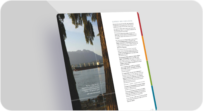 suMMary and conclusion We have come a long way since 1970, when the population of canada was 21 million people and Port Metro Vancouver handled approximately 27 million metric tonnes of cargo. Forty years from today, what will the Port look like? and what does good growth mean for us, our gateway stakeholders and communities between now and 2050? those were the questions that guided us through this Port 2050 project, ultimately leading us to the development of the four plausible, relevant and challenging scenarios outlined in this report. the “local Fortress” and “Missed the boat” scenarios describe worlds with decreased adaptability and capacity in the gateway, where growth is constrained and opportunities are missed. as an organization with a mandate to facilitate trade in the best interest of all canadians, these scenarios are difficult for us to embrace. “rising tide” and “the great transition,” on the other hand, illustrate a future with increasing capacity and, ultimately, more sustainable production and consumption patterns and a new paradigm shift in how society values and measures prosperity. We recognize that different scenarios will appeal to different readers. We have elected to focus our short-term future goals towards “rising tide,” with a 2050 vision leading us towards “the great transition.” We believe this trajectory can successfully balance interests to the benefit of all our industry and community partners. how will we get from here to 2050? it is a progression that is already underway in the gateway, where recent focus has been on collaboration, sustainable growth and community engagement. our revised strategic vision and mission statements will help guide our business priorities, shape new initiatives and ultimately infiltrate every aspect of Port Metro Vancouver’s operations, beginning in the near term with a substantial “The Port is taking more of a update of our land use Plan. this new direction will help us leadership role, engaging the partners understand, anticipate and plan for a transitioning global in dialogues and understanding other social and economic environment. interests – this approach is good.” but we can’t — and won’t — be able to make it on our own. port 2050 pArticipAnt We believe this process represents an important milestone for the Port in terms of taking a more open, collaborative approach to charting our future. What we have discovered is that there is a strong desire among many gateway stakeholders and communities for a continued and sustained high level of engagement and collaboration in planning for our shared future. it is our hope that, in 2050, we will look back four decades and be proud of the choices we’ve made, and how far we have come, together. 25 26