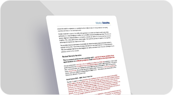 around the world is emphasized as variable to reflect different rates of change between developing countries and those in the developed world. Greater emphasis is given to the ability of the gateway to establish an efficient overall supply chain, particularly as a way of helping to resolve land availability issues for industrial operations. The theme of greater alignment achieved between communities, industry and all levels of government has also been amplified. This, along with the low-carbon supply chain, puts the gateway in a position of competitive advantage for regional and international trade. The transition toward a dominance of renewable and alternative energy sources has been clarified to highlight that by 2050, these forms of energy will represent more than 50 percent of energy production. This acknowledges that the transition happens, but will be somewhat slower than what was implied by the previous version of the scenario. Revised Scenario Narrative This is a scenario where we see a paradigm shift: a period of intense volatility drives rapid transition to a different prosperity model more focused on the triple bottom line. A rough period at first leads into a time of significant volatility in the 2020s that precipitates a move to new global leadership and an amplified focus on additional prosperity metrics (triple bottom line). This creates new, more sustainable (and rebalanced) consumption and production patterns. While there are many losers along the way, the gateway becomes a global winner. A key factor in driving this transition is far- sighted, bold and collaborative leadership at multiple levels — from industry and communities to First Nations and all levels of government. World Context 2015 – 2030: Rocky Transition The first 15 years is a rocky period that sees significant volatility across many areas including global energy markets, the geo-political stage, and the environment, to name a few. While oil prices remain low for the first couple of years, the momentum to develop renewable energy sources at these low oil prices continues at a modest pace. Alternative energy moves down a classic technology curve, attracting investment and making these technologies competitive relative to carbon-based fuels. Economies in the developed world continue to post modest growth, while developing countries have varying growth patterns. At the same time, the effects of climate change through increased frequency and intensity of storms, floods and droughts across the world become more and more profound. In the mid-2020s, there is a confluence of shocking catastrophes, some caused by humans such as a significant oil spill on the Great Barrier Reef which decimates the world treasure, and natural disasters such as a Category 5 hurricane that crosses into New York, razing much of the city. Eastern Europe experiences further destabilization, food security crises and eco-terrorism are becoming more common with levels of economic, commodity, and trade volatility that reach new highs. Out of these crises, however, emerges a new generation of global leadership in Western and Emerging economies. By the end of the 2020s, there is growing global consensus that stronger action is required to try and mitigate climate change and to also deal with the increasing inequalities in wealth across the globe. The groundswell of change in social values toward environmental and human well-being has been building across many of the stronger and most populous countries and becomes mainstream. Governments respond to this and lead the development and implementation of a series of structural global reforms and policy innovations. A global dialogue, thanks to the use of social media, makes this possible and an inflection point in how prosperity is viewed and measured occurs by 2030. This includes more widespread adoption of carbon taxes and triple bottom line prosperity metrics to supplement GDP/GNP, which get adopted as metrics by major equity markets. As part of this, there is greater focus on the true cost of production, which includes externalities related to environmental and human well-being impacts. These changes enable a very different growth model, one that balances the economy, environment and human well-being. Many traditional business models are disrupted, resulting in significant imbalances in Port 2050 Scenario Update Initiative - 2015 30