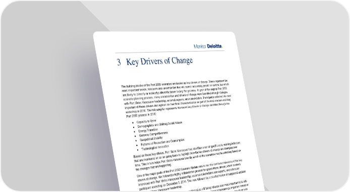 3 Key Drivers of Change The building blocks of the Port 2050 scenarios are known as key drivers of change. These represent the most important trends, forecasts and uncertainties that we cannot accurately predict or control, but which are likely to (directly or indirectly) affect the future facing the gateway. As part of the original Port 2050 scenario planning process, many uncertainties and drivers of change were identified through dialogue with Port Metro Vancouver leadership, external experts, and stakeholders. Participants selected the most important of these drivers and agreed on their final characterization as part of the final scenario-building workshop in 2010. The following list represents the seven key drivers of change identified through the Port 2050 process in 2010: • Capacity to Grow • Demographics and Shifting Social Values • Energy Transition • Gateway Competitiveness • Geopolitical Stability • Patterns of Production and Consumption • Technological Innovation Based on these key drivers, Port Metro Vancouver has identified a set of specific early warning indicators that are monitored on an on-going basis to highlight how the key drivers of change are changing over time. This in turn helps Port Metro Vancouver identify which of the scenarios may be unfolding based on the changes that are happening. One of the major goals of the Port 2050 Scenario Update was to test the continued relevancy of the key drivers of change. We followed a highly collaborative process to update these drivers, which involved interviews with Port Metro Vancouver leadership, external stakeholders and experts, and a broader participant workshop on December 5, 2014. This was followed by a detailed review of suggested updates with Port Metro Vancouver leadership. In summary, the existing list of drivers was confirmed as still being relevant and most important in its role and influence on the future of the gateway. However, a number of new or increasingly important issues or uncertainties were seen to affect each key driver of change. The overall meaning of only one driver was changed, and this was the Technological Innovation driver. The intent of this driver was expanded to capture innovation across all dimensions, for example, technology, policy and regulation. This resulted in it being renamed to “Innovation” so as to reflect this broader intent. The overall themes and meanings of all other drivers remained largely unchanged but some changes have been made to the uncertainties that characterize each of them. These variations include: • Increased focus on how the efficiency of the regional supply chain may evolve and whether gateway stakeholders and groups will be able to work together effectively • Continued increase in importance and relevance of public support to operate, which is relevant across many of the drivers • A greater degree of uncertainty in terms of the rate at which transition to alternative energy sources may occur; the transition is reframed as one driven by demand for change, rather than scarcity of supply or depletion of the resource base • Increased focus on Canada's significant role in global energy markets Port 2050 Scenario Update Initiative - 2015 8
