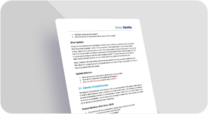• Will higher energy prices dominate? • What alternatives to hydrocarbons will develop, and how quickly? Driver Updates During the consultation process, participants described how a transition to alternative forms of energy is likely to be driven by people’s desire to move away from carbon-based fuels in order to slow climate change, rather than the world running out of oil. As a result, greater emphasis is now given to the demand side of the change (that is, the desire to move away from hydrocarbons) rather than the supply side (that is, hydrocarbons running out and the world reaching “peak oil”). The driver has also been updated to reflect the fact that high oil prices are not a critical factor today, given the recent drop in price. Finally, Canada’s role in the energy markets has been included as a key uncertainty within this driver. This reflects the current situation of a significant number and scale of major energy projects that may, or may not go ahead in BC and Canada. Updated Definition • What alternatives to hydrocarbons will develop, and how quickly? • What will the implications be for global goods transport? • What role will Canada play in global energy markets? 3.4 Gateway Competitiveness The Gateway Competitiveness driver focuses on the competitive position of the gateway with respect to its ability to attract business, labour, investment and trade. In this context, cost, efficiency, and reliability are seen as the primary measures of competitiveness. However, other factors of competitiveness, such as the level of sustainability, are also important to the degree to which these other measures are valued by the gateway’s customers and other stakeholders. Original Definition of the Driver (2010) • How attractive will the gateway be for business, labour, investors and trade? • How productive will the gateway’s labour force be? • Will gateway actors share a common strategy? Driver Updates This driver was seen to be very closely tied to the Capacity to Grow driver, and the gateway’s increased capacity will be a key component of its competitiveness. Port Metro Vancouver leadership, experts and participants saw the efficiency of the gateway’s supply chain as a critical driver in this regard. A very important component of this driver and the scenarios themselves, was highlighted as the ability of various gateway and regional stakeholders (including government and industry) to work together towards the creation of an efficient, integrated and cost-competitive supply chain. As a result, the driver has been updated to emphasize uncertainties around the productiveness of the regional skilled labor force and whether gateway actors will work together to achieve a competitive regional supply chain. The regulatory and legislative environment was identified as continuing to be highly uncertain, which is reflected in the updated definition. This ties closely to the ability of all levels of government to work together, particularly the many municipalities with direct interests in the gateway as a hub for trade. Port 2050 Scenario Update Initiative - 2015 11