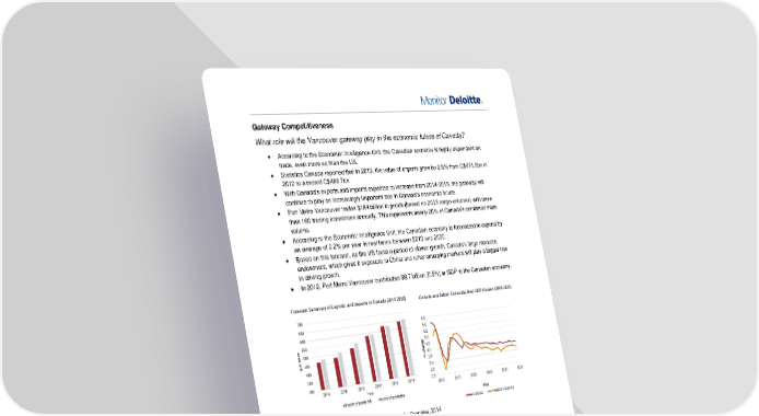Gateway Competitiveness What role will the Vancouver gateway play in the economic future of Canada? • According to the Economist Intelligence Unit, the Canadian economy is highly dependent on trade, even more so than the US. • Statistics Canada reported that in 2013, the value of imports grew by 2.6% from C$474.5bn in 2012 to a record C$486.7bn. • With Canada’s exports and imports expected to increase from 2014-2019, the gateway will continue to play an increasingly important role in Canada’s economic future. • Port Metro Vancouver trades $184 billion in goods (based on 2013 cargo volumes) with more than 160 trading economies annually. This represents nearly 20% of Canada’s combined trade volume. • According to the Economist Intelligence Unit, the Canadian economy is forecasted to expand by an average of 2.2% per year in real terms between 2013 and 2030. • Based on this forecast, as the US faces a period of slower growth, Canada’s large resource endowment, which gives it exposure to China and other emerging markets will play a bigger role in driving growth. • In 2012, Port Metro Vancouver contributed $9.7 billion (0.5%) in GDP to the Canadian economy. Sources: Economist Intelligence Unit, Canada: Overview, 2014 Port Metro Vancouver, Statistics Overview, 2013 How attractive will the gateway be for business, labour and trade? • In January 2013, BC’s six research universities prepared a Labour Market Profile illustrating the challenges and opportunities that lie ahead for the province’s rapidly evolving labour market. • The study finds that as early as 2016, the province will reach a talent deficit, with the number of jobs exceeding the number of qualified people. This deficit will continue to grow through to 2020. • In 2020, approximately 18,800 jobs requiring post-secondary education will go unfilled, and 2,300 requiring trades training. • Competition for skilled trades will intensify as a result of multiple competing projects, including the National Shipbuilding Procurement Strategy and development of LNG projects • In the long term, a lower population growth rate, and a lower labour participation rate (as a result of the ageing population), BC will continue to be challenged by slow labour force growth of 0.7% / year from 2021 to 2035. Port 2050 Scenario Update Initiative - 2015 46