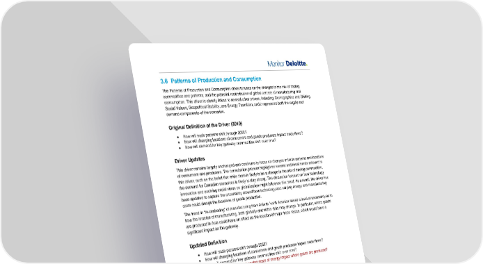 3.6 Patterns of Production and Consumption The Patterns of Production and Consumption driver focuses on the changes in the mix of trading commodities and patterns, and the potential redistribution of global centers of manufacturing and consumption. This driver is closely linked to several other drivers, including: Demographics and Shifting Social Values, Geopolitical Stability, and Energy Transition, and it represents both the supply and demand components of the scenarios. Original Definition of the Driver (2010) • How will trade patterns shift through 2050? • How will changing locations of consumers and goods producers impact trade flows? • How will demand for key gateway commodities shift over time? Driver Updates This driver remains largely unchanged and continues to focus on changes in trade patterns and locations of consumers and producers. The consultation process highlighted several additional trends relevant to this driver, such as the belief that while there is likely to be a change in the mix of trading commodities, the demand for Canadian resources is likely to stay strong. The discussion focused on how technology innovation and evolving social views on globalization might influence this trend. As a result, the driver has been updated to capture the uncertainty around how technology and varying energy and manufacturing costs could disrupt the locations of goods production. The trend in “re-onshoring” of manufacturing from Asia to North America raised a level of uncertainty as to how the location of manufacturing, both globally and within Asia may change. In particular, where goods are produced in Asia could have an effect on the location of major trade routes, which would have a significant impact on the gateway. Updated Definition • How will trade patterns shift through 2050? • How will changing locations of consumers and goods producers impact trade flows? • How will demand for key gateway commodities shift over time? • How will technology and changing costs of energy impact where goods are produced? 3.7 Innovation The Innovation Driver looks at how technological, social and policy innovation will impact the global shipping and manufacturing industries, and the ability of the gateway to leverage innovation and adapt to these changes. Note that this is different to the original definition of the driver as explained below. Original Definition of the Driver (2010) • How will technology improve goods movement and handling? • How large will ships get? • What new transport technologies will emerge? • What innovations could disrupt the transportation and logistics industries? Driver Updates As shown, the original definition of the driver focused solely on technological innovation. While technological innovations were seen as some of the most critical drivers of uncertainty for the future, it Port 2050 Scenario Update Initiative - 2015 13