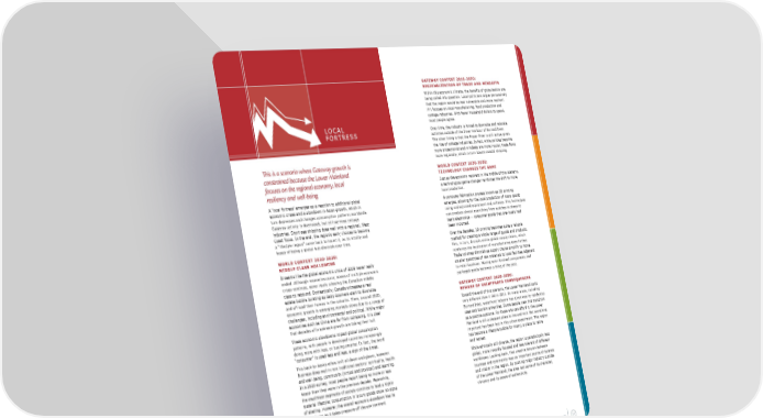 gAteWAy context 2010-2030: regionAlizAtion of trAde And mindsets Within this economic climate, the benefits of globalization are being called into question. local politicians argue persuasively that the region would be less vulnerable and more resilient if it focuses on local manufacturing, food production and cottage industries. With fewer household dollars to spend, local most people agree. Fortress over time, the industry is forced to downsize and relocate activities outside of the inner harbour of burrard inlet. the silver lining is that the Fraser river is still active given the rise of cottage industries. in fact, while policies become more protectionist and mindsets are more insular, trade flows This is a scenario where Gateway growth is more regionally, which in turn boosts coastal shipping. constrained because the Lower Mainland World context 2030-2050: focuses on the regional economy, local technology chAnges the gAme Just as the economy recovers in the middle of this scenario, resiliency and well-being. a technological game-changer reinforces the shift to more a ‘local fortress’ emerges as a reaction to additional global local production. economic crises and a slowdown in asian growth, which in a computer fabrication process known as 3d printing turn depresses and changes consumption patterns worldwide. emerges, allowing for the local production of many goods gateway activity is downsized, but still services cottage using sophisticated equipment and software. this technology industries. short-sea shipping does well with a regional, West can produce almost everything from watches to shoes to coast focus. in the end, the region’s early choices to become basic electronics — consumer goods that previously had a “lifestyle region” come back to haunt it, as its vitality and been imported. hopes of being a global hub diminish over time. over the decades, 3d printing becomes quite a reliable method for creating a whole range of goods and products. World context 2010-2030: this, in turn, disrupts entire global supply chains, which middle clAss holloWing reinforces the localization of manufacturing even further. it seems like the global economic crisis of 2008 never really trade volumes diminish as supply chains simplify to move ended. although recoveries occur, waves of multiple economic smaller quantities of raw materials to local facilities adjacent crises continue, never really allowing the canadian middle to retail locations. Moving semi-finished components and class to rebound. domestically, canada witnesses a real packaged goods becomes a thing of the past. estate bubble bursting as baby boomers start to downsize and off-load their homes in the suburbs. then, around 2020, gAteWAy context 2030-2050: economic growth in emerging markets slows due to a range of BeWAre of unintended consequences challenges, including environmental and political. While major toward the end of this scenario, the lower Mainland looks economies such as china are far from collapsing, it is clear very different than it did in 2011. in many areas, including that decades of breakneck growth are taking their toll. burrard inlet, waterfront industry has given way to residential these economic slowdowns impact global consumption uses and tourism amenities. some people view this transition patterns, with people in developed countries increasingly as a positive outcome. For those who can afford it, the lower doing more with less, or buying smarter. in fact, the word Mainland is still a pleasant place to live and visit. but something “consumer” is used less and less, a sign of the times. important has been lost in this urban experiment. the region this back-to-basics ethos isn’t all doom and gloom, however. has become a lifestyle bubble for many; a place to retire business does well in non-traditional sectors: spirituality, health and retreat. and well-being, community (virtual and physical) and learning. While ethnically still diverse, the region is paradoxically less in a 2020 survey, most people report being no more or less global, more inwardly focused and less tolerant of different happy than they were in the previous decade. Meanwhile, worldviews. looking back, that creative tension between the wealthiest segments of society continue to lead a highly business and community was an important source of balance material lifestyle; consumption in luxury goods show no signs and vitality in the region. by pushing major industry outside of abating. however, the overall economic slowdown has its of the lower Mainland, the area lost some of its character, advantages as it takes pressure off the environment. vibrancy and its sense of authenticity. 13 14