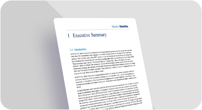 1 Executive Summary 1.1 Introduction In 2010, Port Metro Vancouver embarked on a scenario planning process over the course of a year and more than 100 stakeholders were engaged to establish a shared vision for the future of the Vancouver gateway. The initiative, called Port 2050, resulted in the identification of several drivers of change and four scenarios that stakeholders felt described plausible futures that may unfold as we move toward 2050. These scenarios were named: “The Great Transition”, “Rising Tide”, “Missed the Boat” and “Local Fortress”. While the Rising Tide scenario is the one which has typically been used to frame Port Metro Vancouver’s strategy, the outcome of Port 2050 resulted in an outlook that combines elements of “Rising Tide” and “The Great Transition” scenarios. This combination, referred to as the “Anticipated Future” was seen as the most likely course of future events. In 2014, Port Metro Vancouver engaged Monitor Deloitte to design and deliver a program to test the continued relevancy of the key drivers of change and the scenarios, and to recommend updates as necessary. In recognition of the importance of engaging a wide group of gateway stakeholders - both internal and external to Port Metro Vancouver - the program was designed to be highly collaborative in nature. In-depth interviews were conducted with Port Metro Vancouver leadership and staff, as well as a diverse group of stakeholders and experts. A highlight of the process was a two day reception and workshop, held on December 4 and 5, 2014 in Vancouver. Over 70 participants attended that workshop, coming from many groups and organizations that have a stake in the future of the gateway such as community groups, First Nations, industry and all levels of government. In addition to the participants that attended the workshop, expert speakers presented on important topics to challenge the participants’ imagination and any pre-conceived assumptions about the future. Based on the interviews, our research, and participant input from the workshop, draft updates to scenarios and key drivers of change were presented and reviewed with Port Metro Vancouver leadership at a workshop held on January 29, 2015. This report presents the recommended updates to Port 2050 key drivers of change and scenarios resulting from the engagement process. 1.2 Key Drivers of Change The key drivers of change identified in 2010 form the building blocks of the four scenarios. Based on our analysis and the feedback received, very few structural changes to drivers were required and all were confirmed as still being relevant today. The one exception to this was the broadening of the Technological Innovation driver to capture all types of innovation, including policy setting and the regulatory environment, in addition to technology. The other changes made to the drivers as a result of the update process were in relation to how they are characterized and the issues or uncertainties that were relevant to each driver. Some of these issues and uncertainties include: the increasing importance of public support for port operations and other industrial operations in the region; uncertainty surrounding the rate at which a transition to alternative energy sources may occur and how much change will happen; and an increased focus on how the role of Canada in global energy markets may change through major energy projects and Canada’s competitiveness with other producers. Participants also felt that a key uncertainty was whether greater Port 2050 Scenario Update Initiative - 2015 1