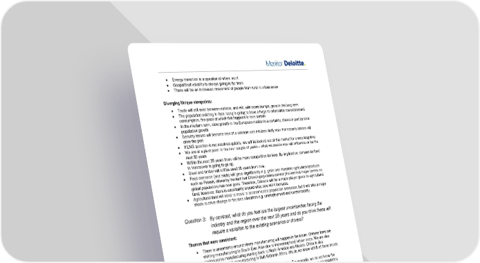 • Energy transition is a question of when, not if • Geopolitical volatility is always going to be there • There will be an increased movement of people from rural to urban areas Diverging/Unique viewpoints: • Trade will still exist between nations, and will, with some bumps, grow in the long term • The population existing in Asia today is going to have a huge re-orientation toward internal consumption, the pace at which this happens is less certain • In the medium term, slow growth in the European market in a certainty, driven in part by slow population growth • Security issues will become less of a concern and it is less likely now that security issues will drive the port • If LNG question is not resolved quickly, we will be locked out of this market for a very long time • We are at a pivot point in the next couple of years – what we decide now will influence us for the next 30 years • Within the next 35 years there will be more competition for land. By implication, demand for land in Vancouver is going to go up. • Steel and timber will still be used 35 years from now. • Food demands (and trade) will grow significantly e.g. grain and therefore agricultural products such as Potash, driven by the fact that China’s population control (the last real major control on global population) has now gone. Therefore, Canada will be a major player given its agricultural land, however, there is uncertainty around what rate will it increase. • Agricultural land will need to move to accommodate population increases, but it will take a major shock to drive change in the land allocation e.g. unemployment and unaffordability. Question 3: By contrast, what do you feel are the largest uncertainties facing the industry and the region over the next 35 years and do you think these will require a variation to the existing scenarios or drivers? Themes that were consistent: • There is uncertainty around where manufacturing will happen in the future. Chinese firms are shifting manufacturing to South-East Asia due to increasing local labour costs. We are also seeing some manufacturing moving back to North America and Mexico. China is also experimenting with manufacturing in Sub-Saharan Africa. We do not know which of these trends, in any, will dominate in the future. • Whilst climate change is certain, the impact is less certain. For example, we do not know the extent and speed at which water levels will change and the impact this will have on population, agriculture and industry in BC and the rest of Canada. There may be knock-on implications on trade routes to and from the gateway. • The level of future funding is an uncertainty. This very much depends on the extent to which the government will continue to drive investment in the gateway and infrastructure investment. • The global economy will impact the port. The strength of the Canadian dollar in the future, how volatile the financial markets will be and future interest rates are all unknown. • Where economic growth happens and how fast it happens, particularly in countries such as China, India and Sub-Saharan Africa, is largely unknown, but will impact trade. • The gateway’s ability to secure and maintain public support to operate in largely unknown. Diverging/Unique viewpoints: • There is a possibility of creating a regional model to plan on a regional basis. • We do not know whether the port will get approval for terminal 2. • It is difficult to predict the future demand for commodities. From a resource perspective both supply and demand are very unpredictable but are important for decision making. Port 2050 Scenario Update Initiative - 2015 36