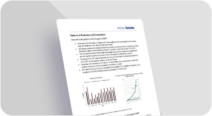 Patterns of Production and Consumption How will trade patterns shift through to 2050? • According to the Economist Intelligence Unit, trade patterns will be increasingly focused around Asia, the Middle East and Africa over the next 5 years. • Developing countries will continue to become an even more dominant force in global trade. These developing regions are forecasted to average 7% growth in world trade between 2015-2019. • The 21 economies of the Trans-Pacific partnership now account for nearly 50% of global trade with this number expected to increase as trade strengthens in participating countries. • According to the IMF, trade between the Americas and Asia Pacific has increased significantly since 1970 and has greatly surpassed trade with Europe. • According to the Government of Canada, the Asia Pacific gateway and Corridor Initiative will continue to be key to Canada’s long term prosperity and growth • Port Metro Vancouver has been involved in several projects in the initiative including the recent completion of the Robert Banks Causeway Overpass in October 2014. Sources: The Economist Intelligence Unit, Global Forecasting Service: World Trade, 2014 How will changing locations of producers and consumers impact trade? • According the World Economic Outlook on the Global Agenda 2014, consumption will continue to increase significantly as the middle class in emerging markets continue to grow. • By 2020, Asia’s middle class will explode to 1.75 billion. • By 2020, consumption in both China and India will increase by over 300%, compared to a 48% increase in the United States. • According to the Economic Intelligence Unit, global trade patterns will be driven by strong income growth and increased demand in these rapid-growth markets. • According to a study conducted by the World Trade Organization on International Trade in 2013, over half of merchandise exports from developing economies were sent to other developing economies. This is predicted to increase as consumption levels in developing countries grow. • The study found that the growth of intra-regional trade among Asia's new economic superpowers will lead to a renewed concentration of global demand. • This shift will be an important consideration for exporters when making strategic plans and decisions over the next 20-30 years. Port 2050 Scenario Update Initiative - 2015 50